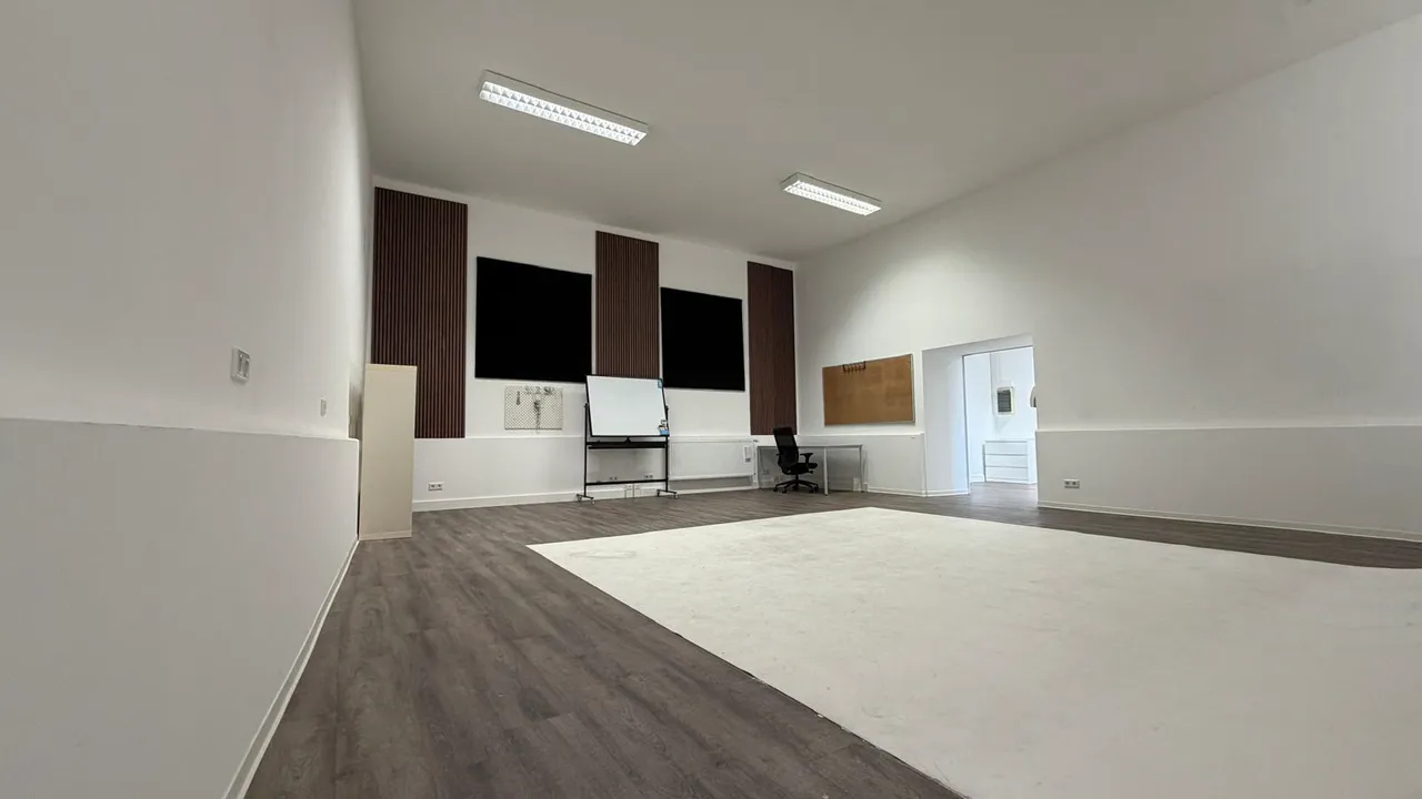 Das Erdgeschoss überzeugt durch helle Räume und eine großzügige Deckenhöhe von ca. 2,98 Metern, die ein offenes und professionelles Arbeitsumfeld schaffen. Der ehemalige Fotostudio- beziehungsweise Konferenzbereich verfügt über eine außergewöhnliche Deckenhöhe von ca. 3,98 Metern und eignet sich ideal für Präsentationen, Schulungen, kreative Nutzungen oder repräsentative Kundenbereiche.