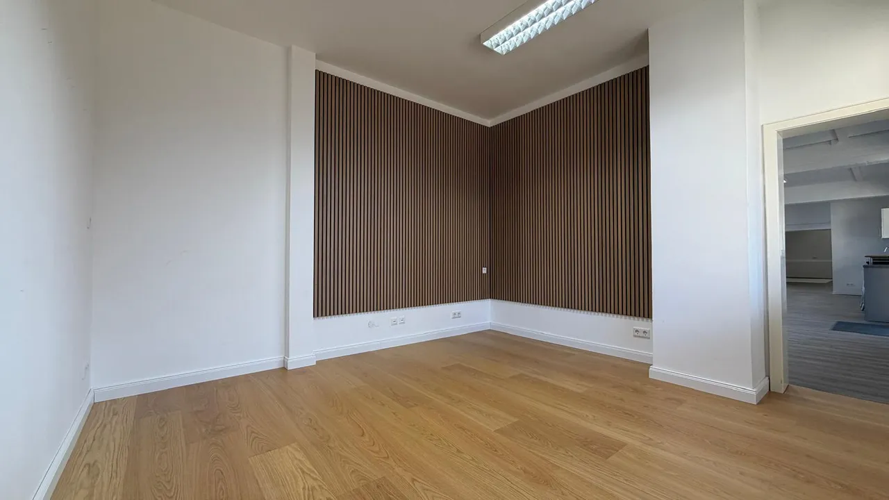 Die Ausstattung ist gepflegt und funktional. Akustikelemente sorgen für eine angenehme Raumakustik, der Vinylboden ist robust und pflegeleicht. Eine integrierte Küchenzeile mit Herd, Backofen, Spülmaschine und Kühlschrank ermöglicht eine komfortable Nutzung im Arbeitsalltag.