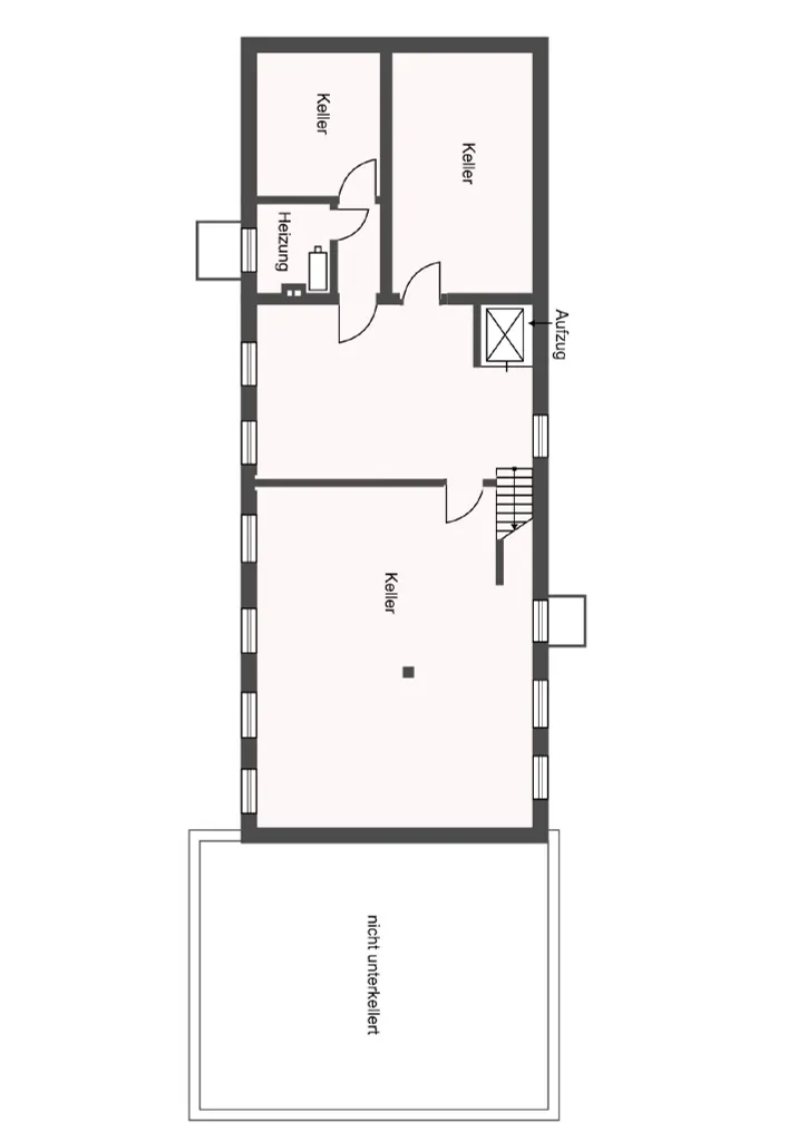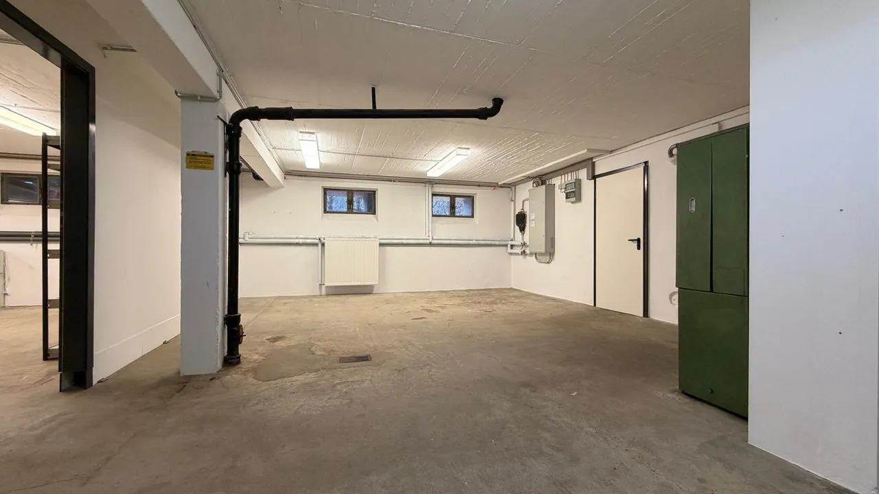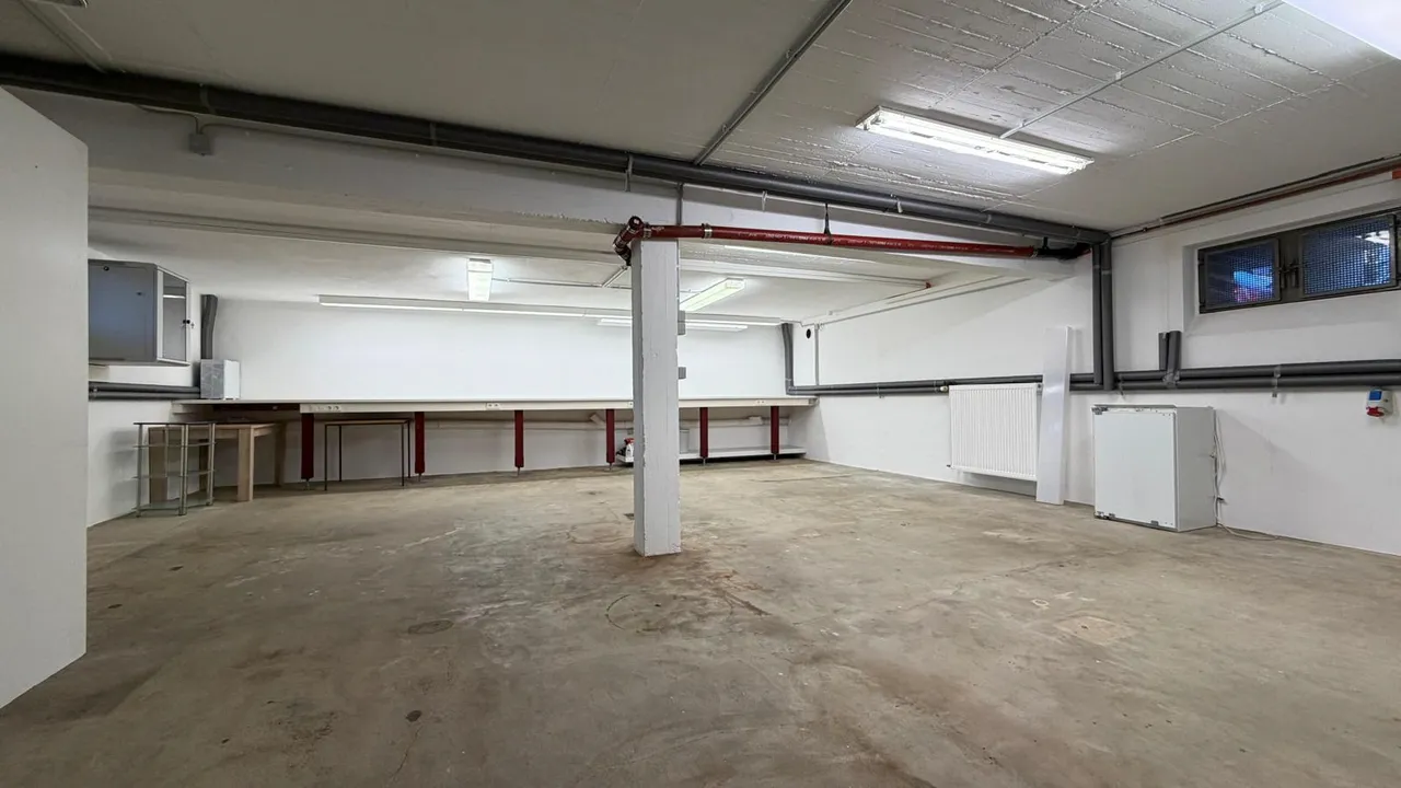 Das Untergeschoss ist direkt über das Erdgeschoss zugänglich und verfügt über drei separate Kellerräume. Zusätzlich ist ein Wasseranschluss vorhanden, was die Fläche auch für Lager, Technik oder produktionsnahe Nutzungen interessant macht.