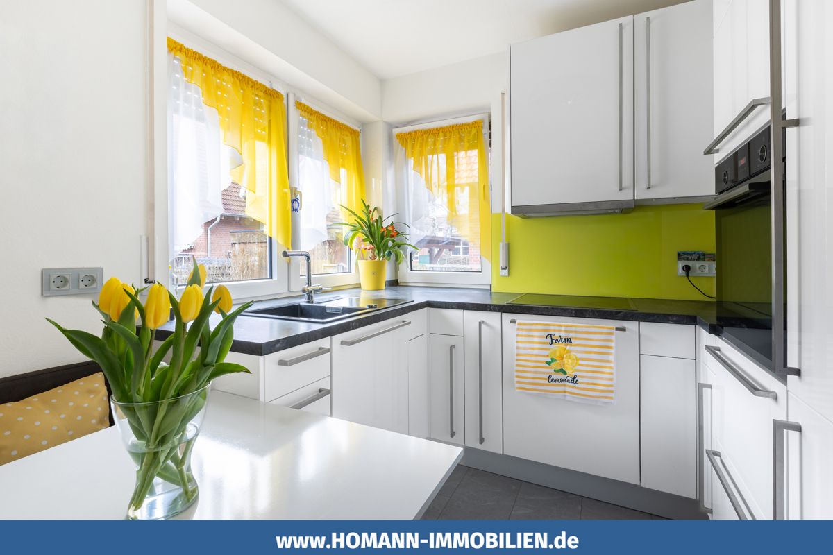 Die angrenzende Küche wurde vor wenigen Jahren erneuert und ist daher modern wie funktional. Ein Gäste-WC ergänzt diese Ebene.