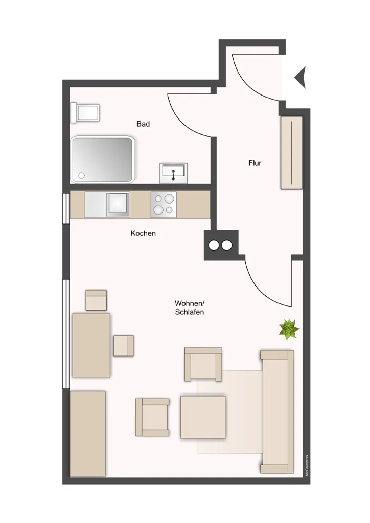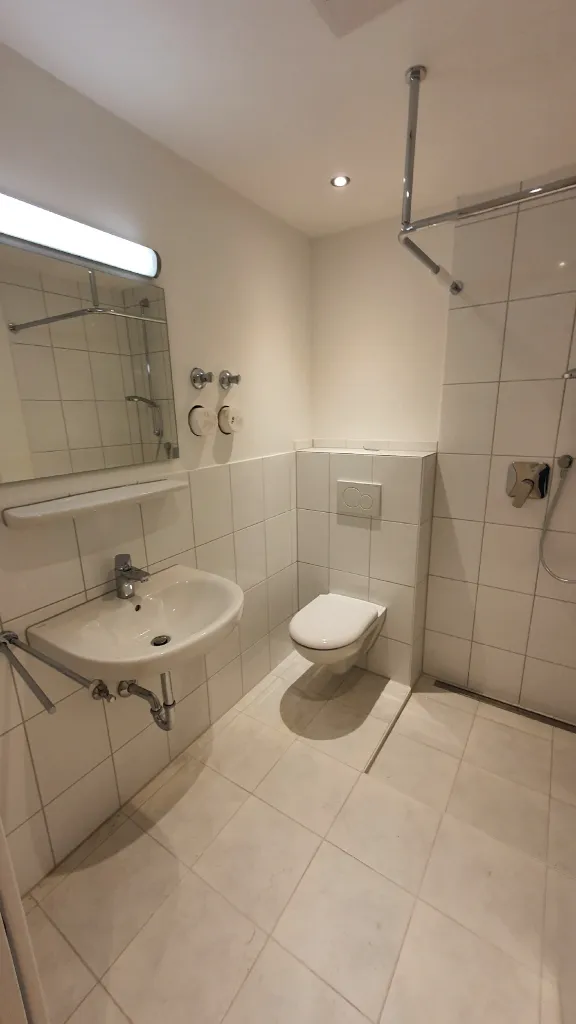 Das gepflegte Einzimmerappartement ist mit einem modernen, hellen Vinylboden ausgestattet, der dem Appartement eine warme und freundliche Atmosphäre verleiht. Die offene Küchenzeile verfügt über einen Backofen sowie ein Cerankochfeld mit vier Herdplatten und bietet damit den nötigen Komfort selbst auf wenig Platz. Auch das Badezimmer ist modern gestaltet und mit einer ebenerdigen Dusche ausgestattet. Abgerundet wird das Appartement mit zusätzlichem Stauraum durch das eigene Kellerabteil sowie diverse Gemeinschaftsflächen wie Fahrradkeller und einen Waschraum mit Waschmaschine und Trockner (Wertmarkenautomat).