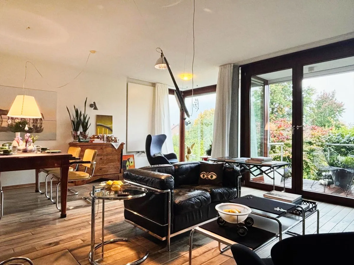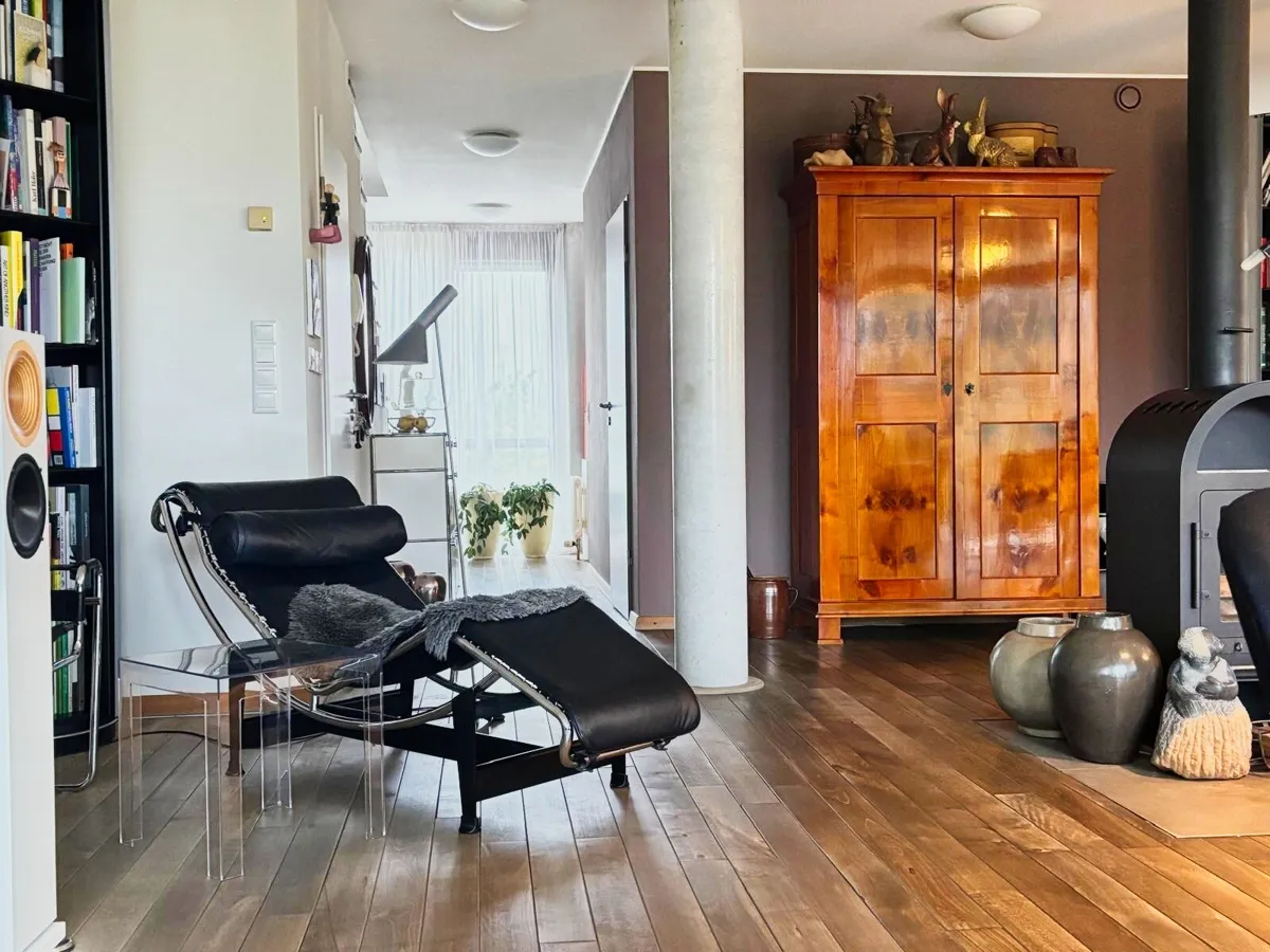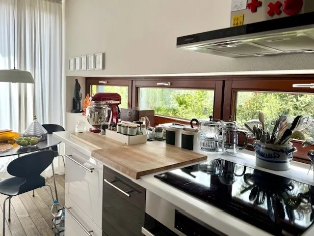 Ein außergewöhnliches Haus mit Elementen aus der Bauhaus-Architektur sucht neue Eigentümer, die dieses offene, moderneKonzept der Raumaufteilung für sich wünschen und suchen. Ihr Lebensmittelpunkt befindet sich in der „Belle Etage“, im ersten Obergeschoss mit einem freien Blick in den liebevoll angelegten Garten. Der Zugang erfolgt über den vorgelagerten West-Balkon und elegante Naturstein-Trittstufen führen zur unteren Ebene in den Garten.