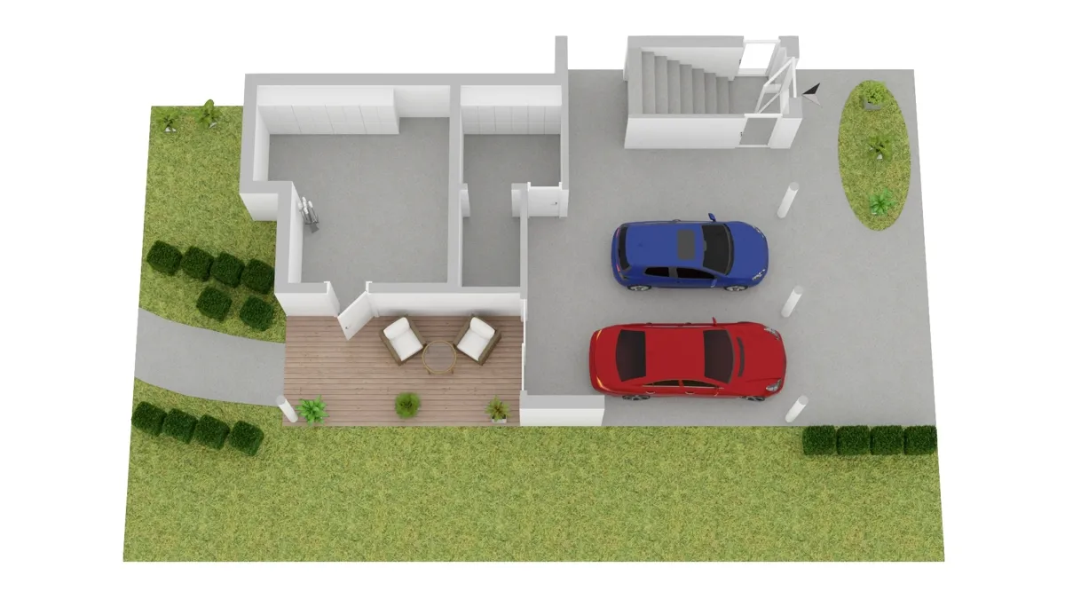 - Überdachte Stellplätze für zwei PKWs und Abfallbehälter