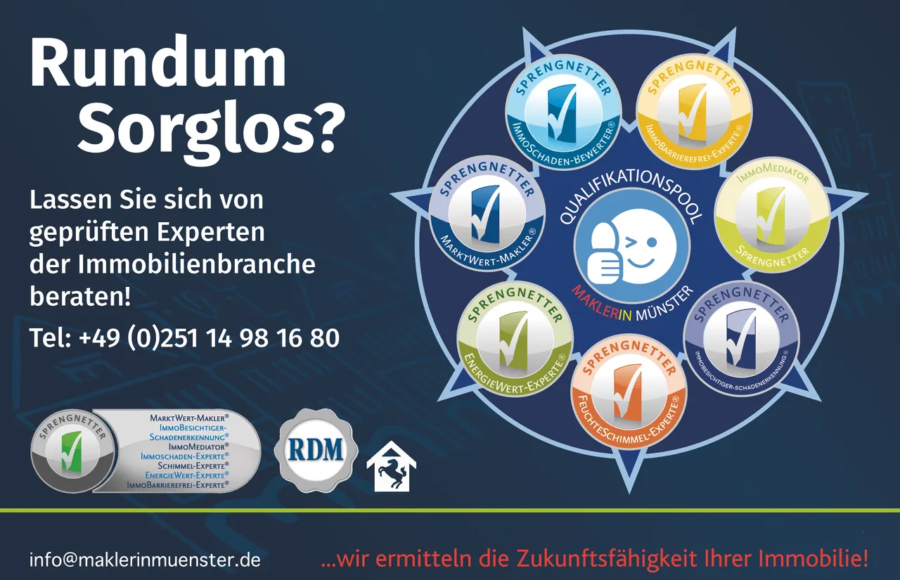 Fotos und Grafiken unterliegen dem Copyright der Firma Maklerin Münster. Bezüglich der Objektdaten ist die Firma Maklerin Münster auf die Auskünfte der Verkäufer / Vermieter, Bauträger, oder der Behörden angewiesen. Für die Vollständigkeit und Richtigkeit kann daher keine Haftung übernommen werden. Schadensersatzansprüche sind aus diesen Gründen uns gegenüber ausgeschlossen. Irrtum bleibt ausdrücklich vorbehalten.