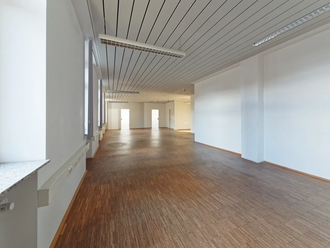 Die Fläche ist über zwei separate Zugänge vom Treppenhaus aus erschlossen, was zusätzliche Flexibilität für verschiedene Nutzungskonzepte oder eine interne Flächenteilung bietet.