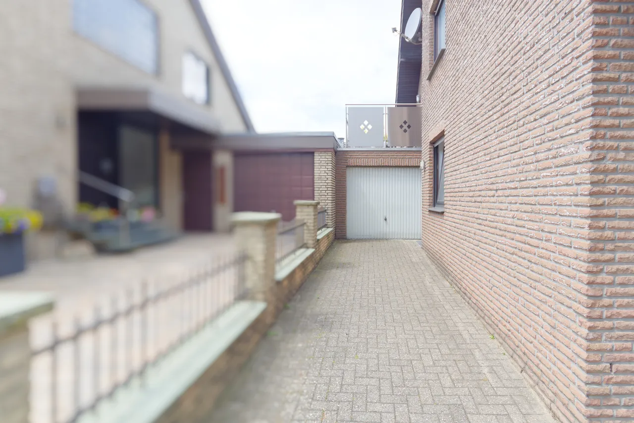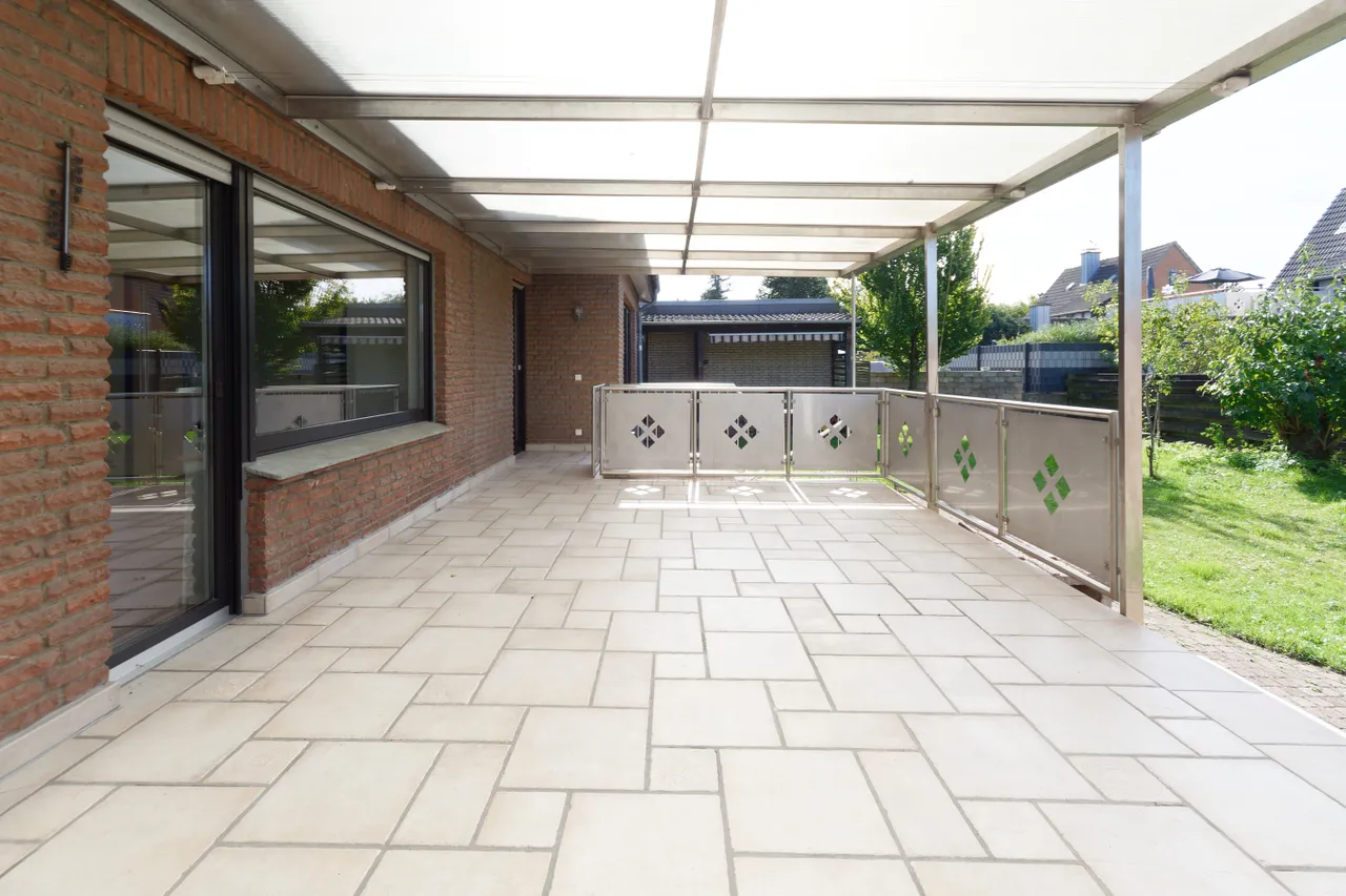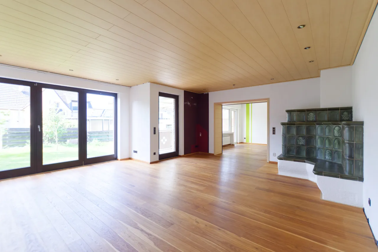 Über den Hauseingang gelangen Sie in den Flur mit Platz für eine Garderobe. Rechte Hand befindet sich ein modernes Gäste-WC. Weiter den Flur entlang liegen rechts das Esszimmer und das großzügige Wohnzimmer, welche mit Holzdielen als Fußboden ausgestattet sind. Im Wohnzimmer ist eine Fußbodenheizung verlegt. Zudem steht hier ein stillgelegter Kachelofen. Der Kamin ist zweizügig ausgelegt. Die Räume bestechen durch große Fensterfronten und verglaste Terrassentüren, die zum Garten ausgerichtet sind. Auf dieser Seite sind ebenfalls die Küche und ein angrenzender Hauswirtschaftsraum angeordnet. Vom Wohn- und Esszimmer aus betreten Sie die überdachte Terrasse mit ca. 28 m² Nutzfläche. Diese Haushälfte beansprucht den gesamten Garten. Somit ergibt sich eine Gartenfläche von ca. 130 m². Zudem wurde die Garage als Doppelgarage konzipiert. Im hinteren Teil der Garage ist ein abgetrennter Geräteraum. Das Rolltor wird elektrisch betrieben.