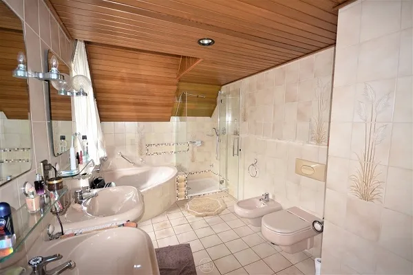 Im Obergeschoss empfängt Sie die Empore von welcher man einen schönen Blick über den Wohnbereich hat. Linke Hand befindet sich ein Zimmer und rechts das große Schlafzimmer. Hieran schließt sich das Badezimmer mit Doppelwaschbecken, Dusche, Eckbadewanne und Bidet an.