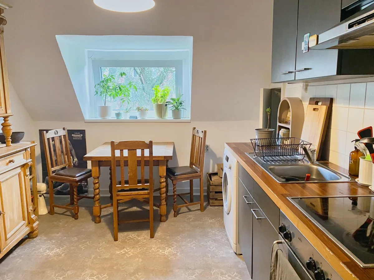 Die Küche verfügt über ausreichend Platz auch für einen großen Esstisch. Praktischerweise schließt sich ihr darüber hinaus noch ein Abstellraum an.