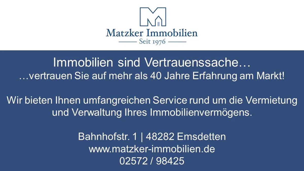 Bitte haben Sie Verständnis, dass wir aufgrund der Nachweispflicht gegenüber dem Eigentümer und gesetzlicher Bestimmungen (Geldwäschegesetz) nur Anfragen mit vollständiger Nennung Ihres Namens, Ihrer Anschrift und einer Rückrufmöglichkeit bearbeiten können. Nachdem Sie uns Ihre Daten bekannt gegeben haben, übersenden wir Ihnen gerne ein Exposé oder vereinbaren mit Ihnen einen Besichtigungstermin.