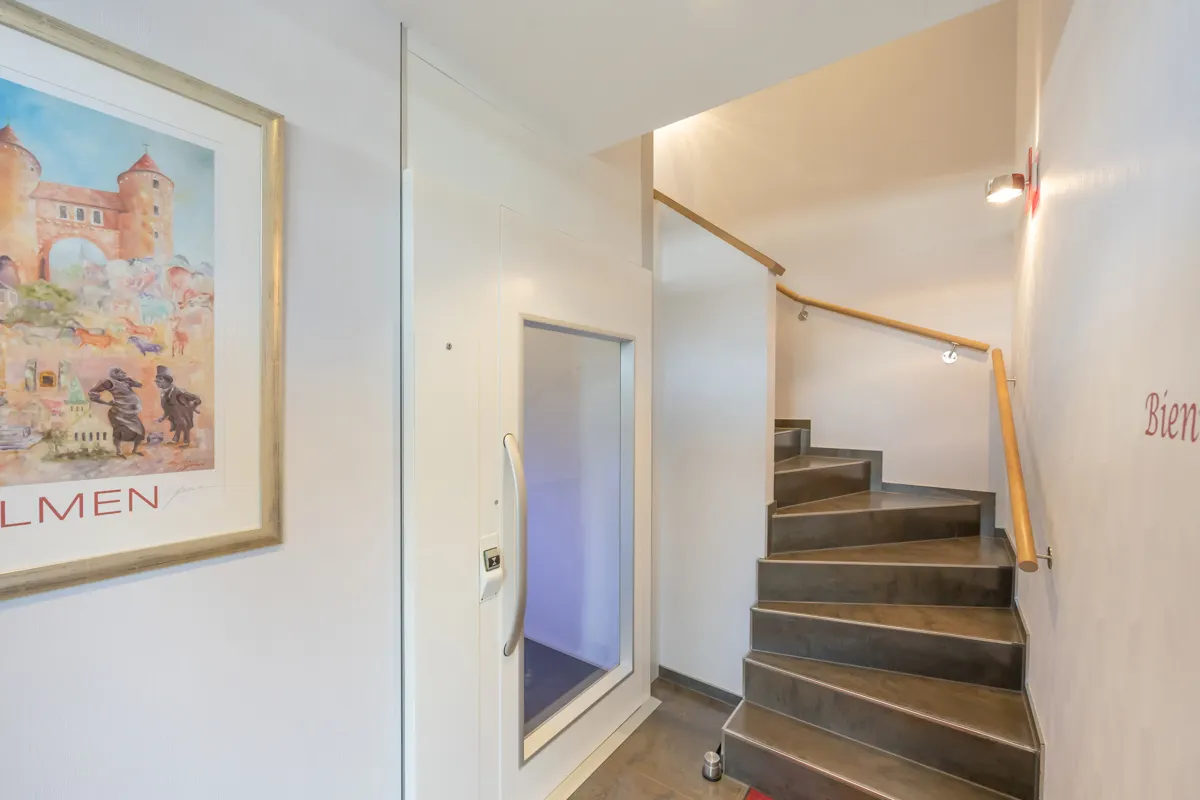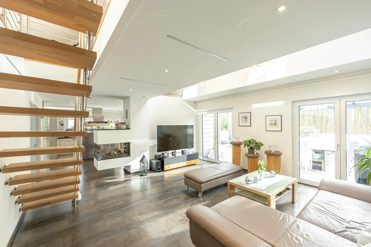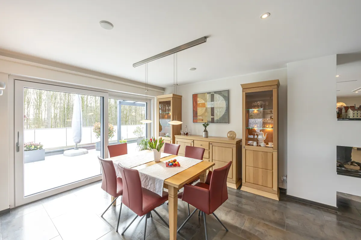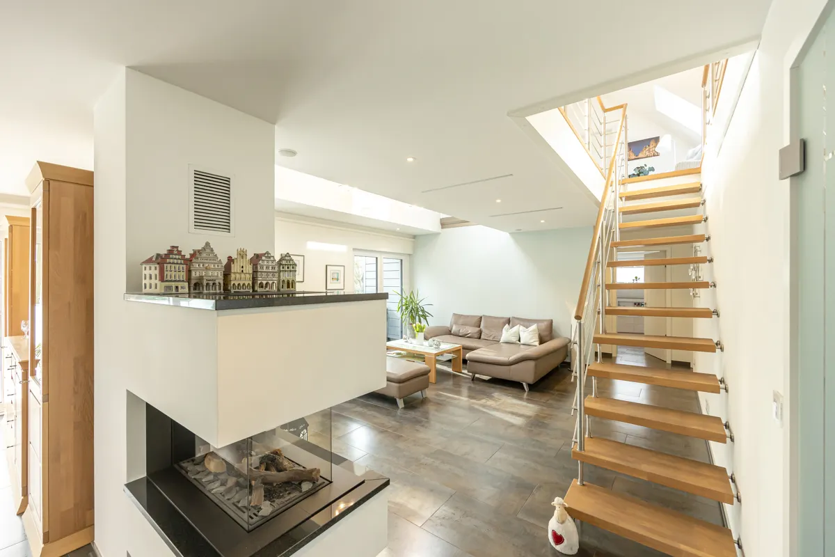 Ein besonderes Highlight ist der stilvolle Wohnbereich mit Gaskaminofen, der eine warme, repräsentative Atmosphäre schafft. Der Aufzug (TÜV-frei) bietet komfortablen Zugang und erhöht die Alltagstauglichkeit des Penthouses deutlich.