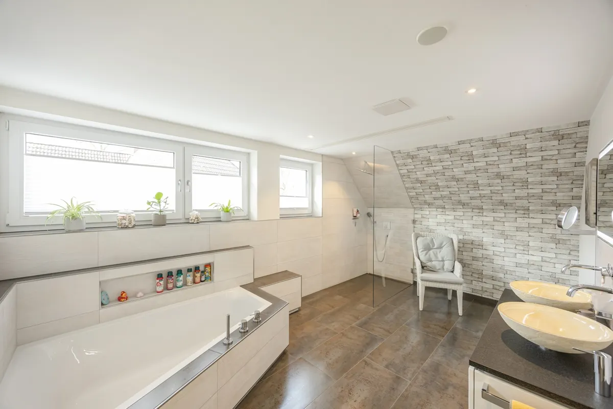 Auch im Sanitärbereich setzt die Wohnung Akzente: Neben einem Gäste-WC mit Dusche steht ein großes Duschbad zur Verfügung, ausgestattet mit übergroßer Badewanne sowie Beamer und Leinwand – Wellness und Entertainment in einem. Eine Saunavorbereitung ist bereits vorhanden.
