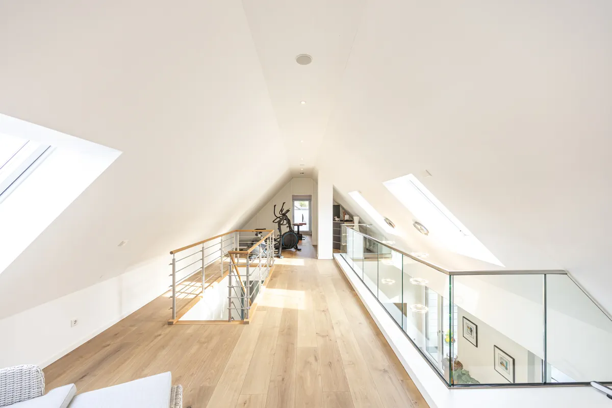 Im Dachgeschoss befindet sich unter anderem ein Büro, das mit einem Klimagerät ausgestattet ist – ideal für konzentriertes Arbeiten auch in den Sommermonaten.