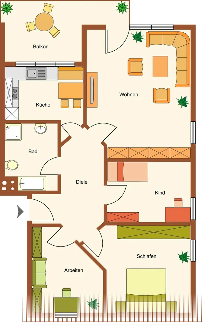 Die Wohnfläche auf ca. 88 m² verteilt sich auf ein helles Wohn- und Esszimmer mit direktem Zugang zum Balkon, eine Küche mit Essplatz, eine Diele, ein Schlafzimmer, ein Kinderzimmer, ein Arbeits- bzw. Gästezimmer sowie ein Badezimmer mit Wanne, Dusche und WC. Das Badezimmer wurde umfassend saniert und bietet bereits eine moderne Ausstattung. Auch die Etagenheizung wurde erst in 2021 erneuert.