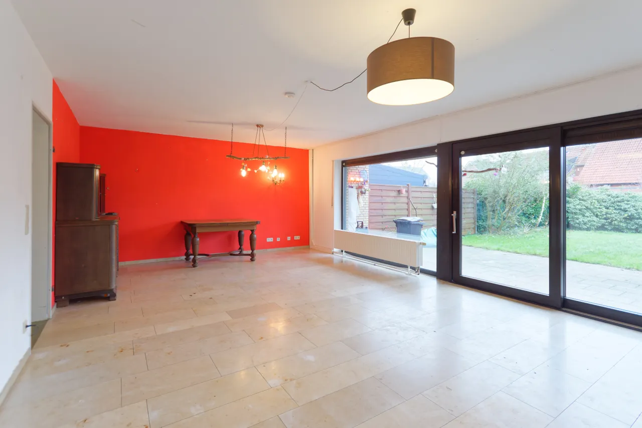 Das helle Wohnzimmer mit seinen großen Fensterfronten öffnet sich zur Terrasse und bietet einen wunderbaren Blick ins Grüne – hier kann man den Tag entspannt ausklingen lassen. Ein Kaminanschluss ist vorhanden und sorgt bei Bedarf für eine Extraportion Gemütlichkeit.