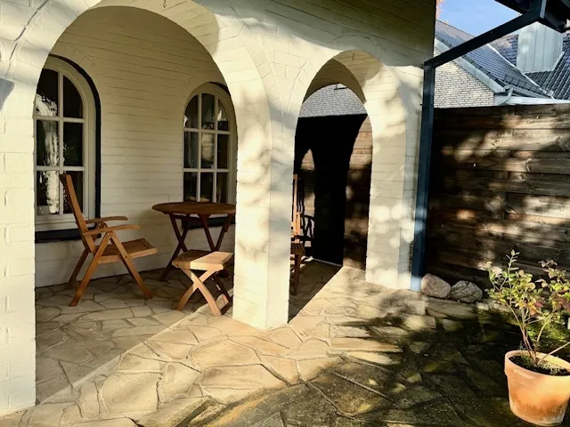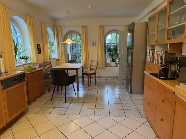 Die weiße Fassade mit farblich abgesetzten Passepartout um charakteristische Rundbogenfenster mit Sprosseneinteilung, verleiht dem Gebäude einen zeitlos eleganten Charakter.