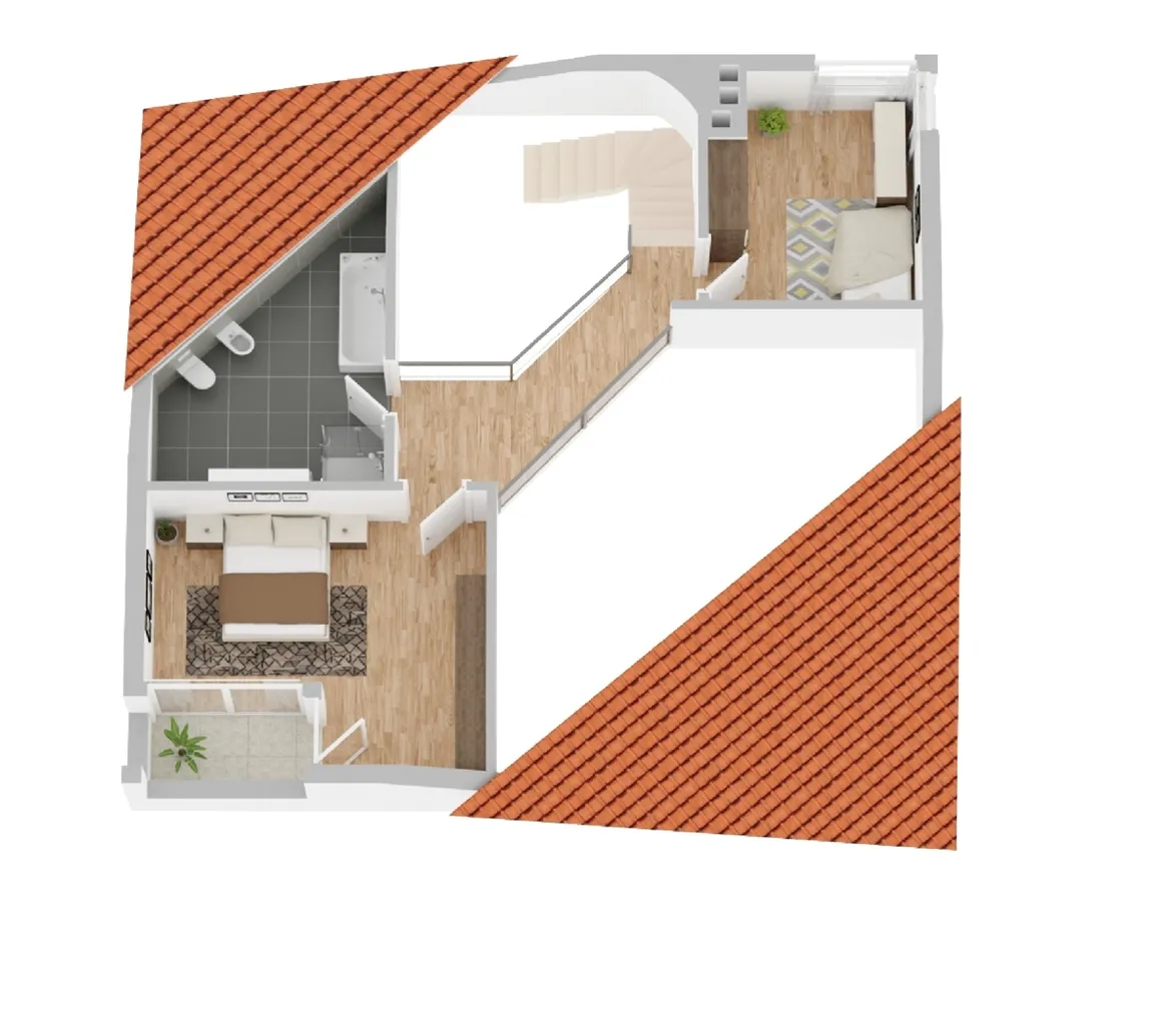 Das Bad mit Wanne und Dusche, Doppel-Waschtisch, WC und Bidet sowie zwei Schlafzimmer und eine Loggia erreichen sie über einen Treppenaufgang hinauf zur offenen Galerie. Genießen Sie den Blick hinunter in das geräumige Erdgeschoss und in den sonnigen Garten.