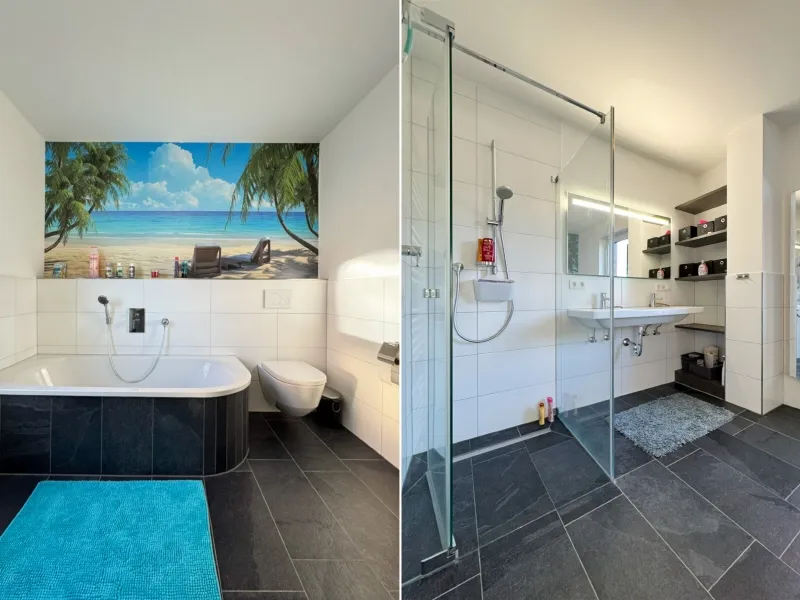 Im Obergeschoss befinden sich ein Schlafzimmer mit separatem Arbeitszimmer, ein Kinderzimmer sowie ein modernes Tageslichtbad mit bodentiefer Dusche und Badewanne. Das Dachgeschoss erweitert die Wohnfläche um ein weiteres Schlafzimmer, ein Duschbad und eine praktische Einbauschranknische – ideal als Gästeetage oder privater Rückzugsbereich.