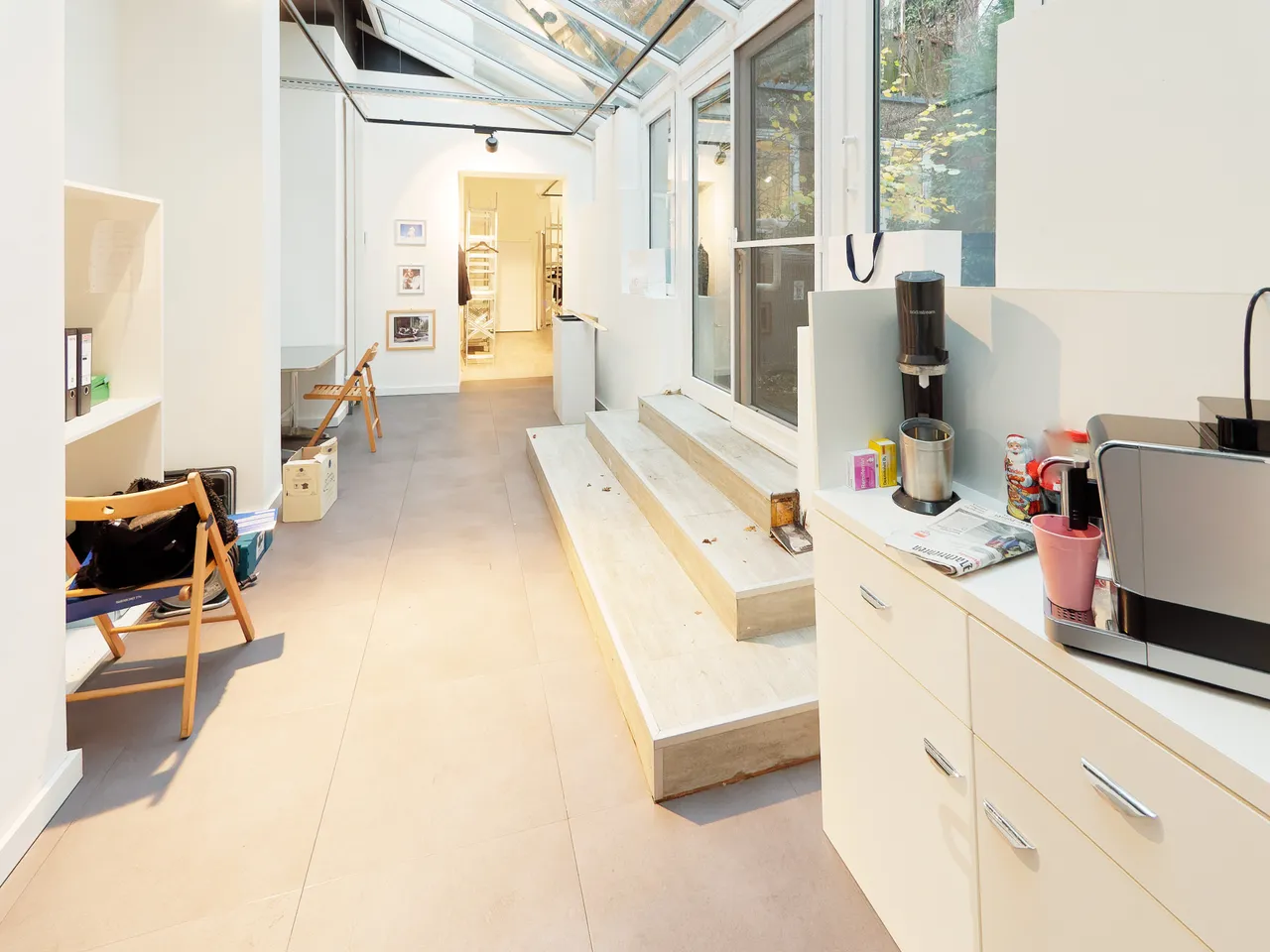 Hinter dem Ladenlokal auf der rechten Seite mit 269 m² befindet sich ein warmer Wintergarten aus dem Jahr 2005, der als Sitzecke für Kunden oder als Personalraum mit einer Teeküche genutzt werden kann. Von hier aus lässt sich der zugehörige Garten und die Nebennutzfläche mit ca. 50 m² zum Lagern von Waren betreten. Im Kellergeschoss befinden sich zwei WCs sowie weitere 150 m² Lagerfläche. Auf der Fläche wurde ein Vinylboden verlegt (teils mieterseitig durchgeführt).