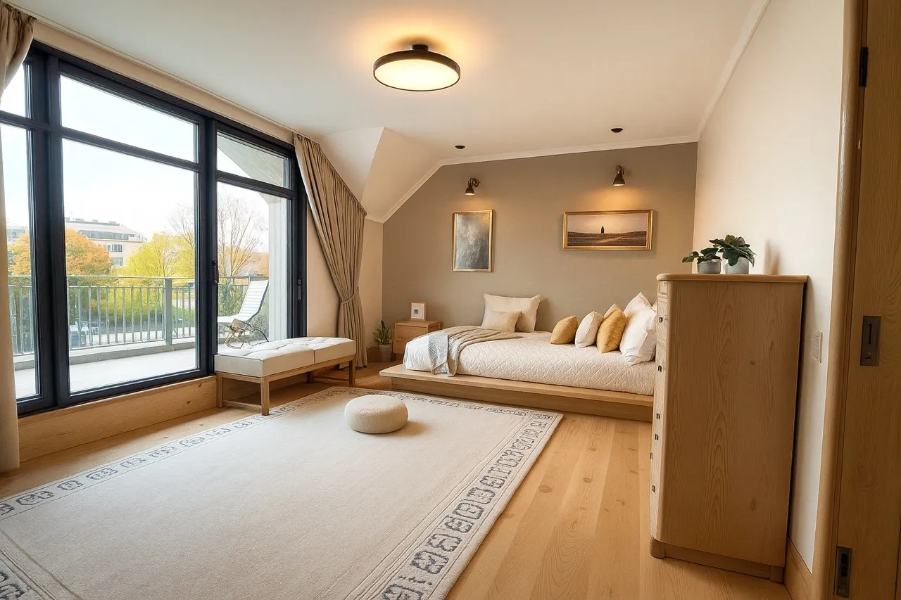 Der rund 49 Quadratmeter große Wohn- und Essbereich ist offen gestaltet und bildet das Zentrum der Wohnung. Große Fenster lassen viel Tageslicht herein und schaffen eine freundliche Atmosphäre. Vom Wohnraum aus gelangen Sie auf den westlich ausgerichteten Balkon, der sich perfekt zum Entspannen oder für gemeinsame Mahlzeiten eignet.