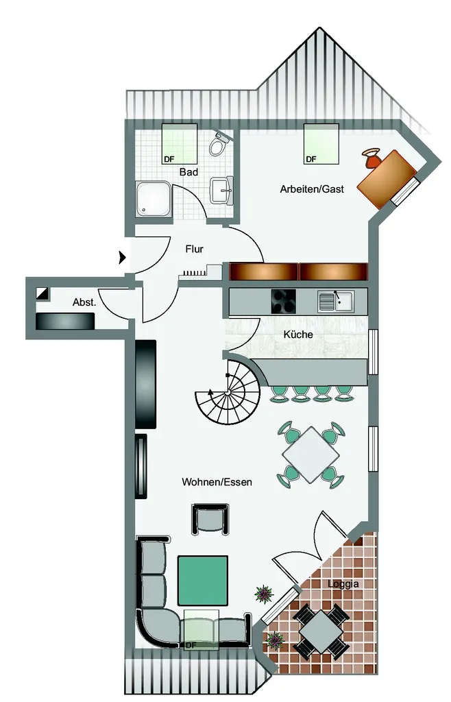 Ein gepflegtes Wohnhaus mit insgesamt nur 6 Wohnungen und ruhigen, überwiegend langjährigen Mitbewohnern. Die Maisonettewohnung verläuft über das II. OG und Dachgeschoss. Aufgeteilt in Wohn-/Esszimmer mit offener Küche, großzügiger Südbalkon, Flur, Arbeits-/Kinderzimmer, Duschbad mit WC, eine offene Wendeltreppe führt auf die Galerie mit Platz für einen Arbeitsbereich, Schlafzimmer mit begehbarem Schrank, Bad mit Wanne und WC.