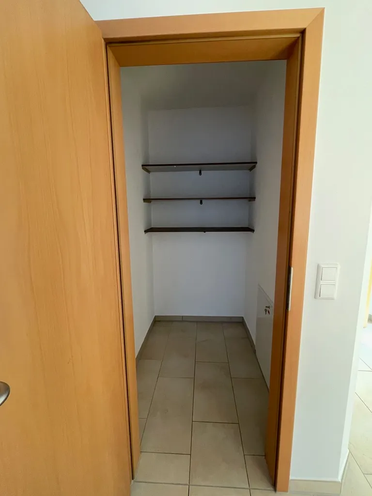 Der offene Küchen- und Essbereich wird durch einen angrenzenden Hauswirtschaftsraum ergänzt, der ausreichend Platz zum Verstauen bietet. Hier lassen sich Waschmaschine und Co. praktisch und unauffällig unterbringen ohne dass diese im Badezimmer Platz einnehmen. Zusätzlichen Stauraum bietet ein separater Abstellraum innerhalb der Wohnung, der bereits mit Regalen ausgestattet ist.