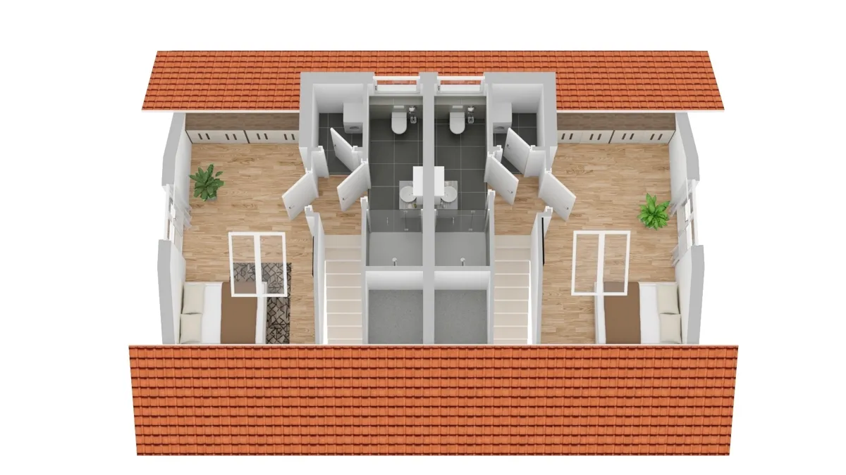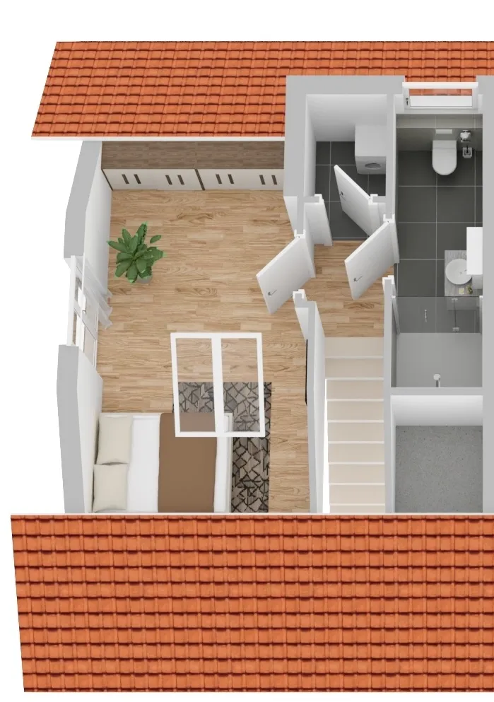 Über eine elegante Holztreppe gelangen Sie ins Dachgeschoss, das ein geräumiges Schlafzimmer, einen praktischen Abstellraum und ein weiteres Bad mit ebenerdiger Dusche und WC beherbergt.