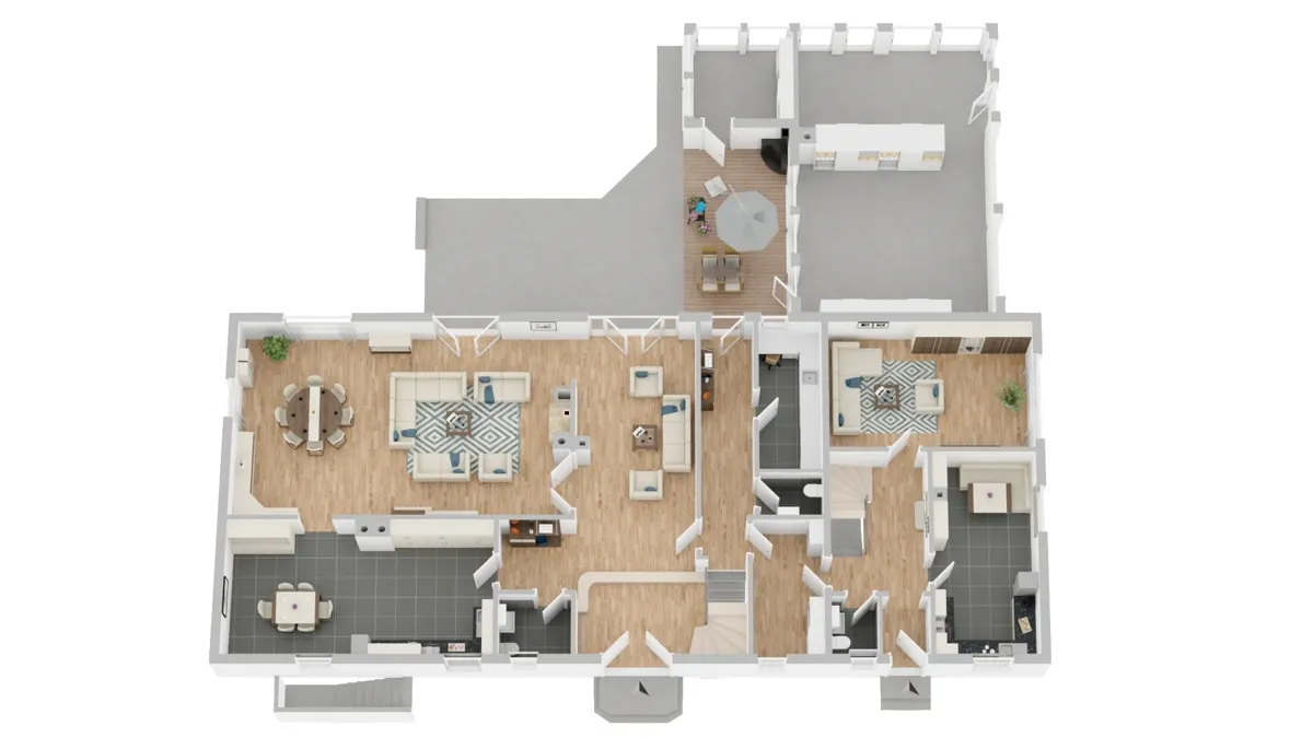 -Haupthaus der alten Mühle: 262m² Wohnfläche und 8 Zimmern, mit offenem Herdfeuer u. Galerie, Klimaanlage im Schlafbereich + Veranstaltungsraum mit Cocktailbar von ca. 60m², inkl. Kühlzelle für zB. Wild + Südterrasse mit vollausgerüsteter Outdoorküche etc. + Ausbaureserve im Dachgeschoß des Veranstaltungsraums.