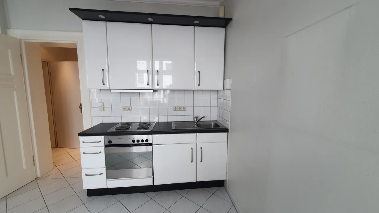 Die vorhandene Einbauküche ist funktional ausgestattet und umfasst einen Backofen mit vier Herdplatten, eine Spüle sowie einen Kühlschrank – ideal für den direkten Einzug ohne zusätzlichen Aufwand.