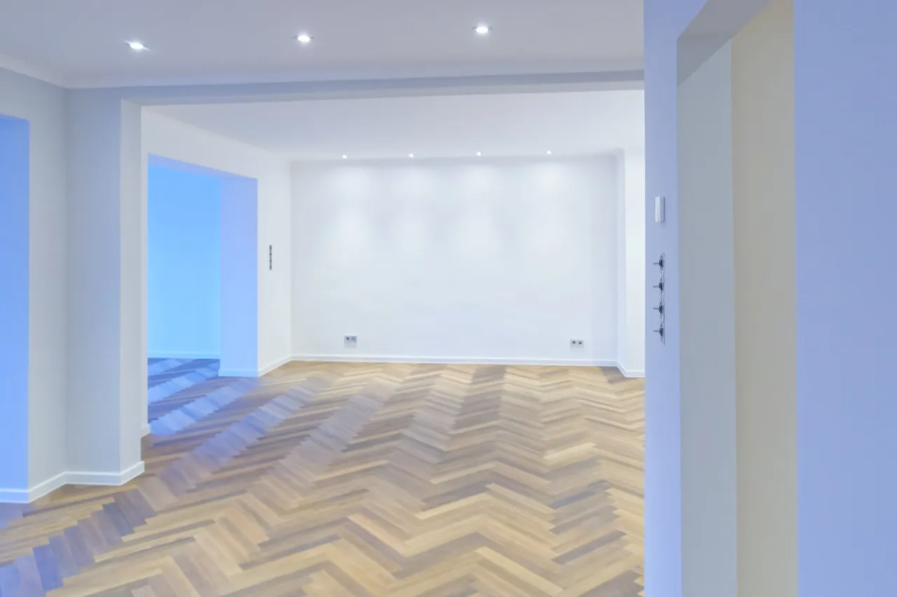 Bodenbeläge: Echtholz-Parkett in Fischgrätmuster, hochwertig verlegt
