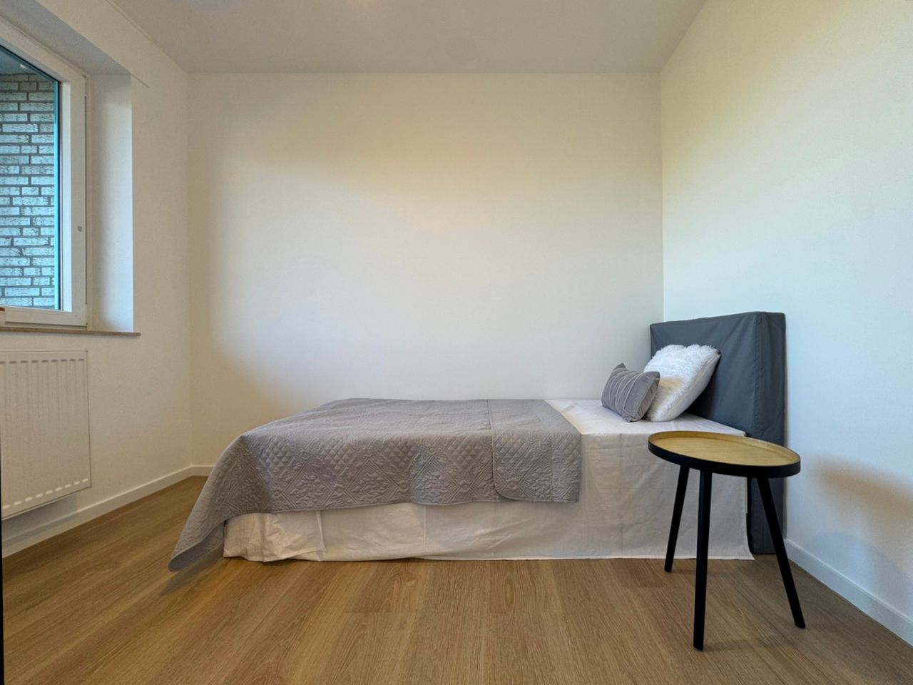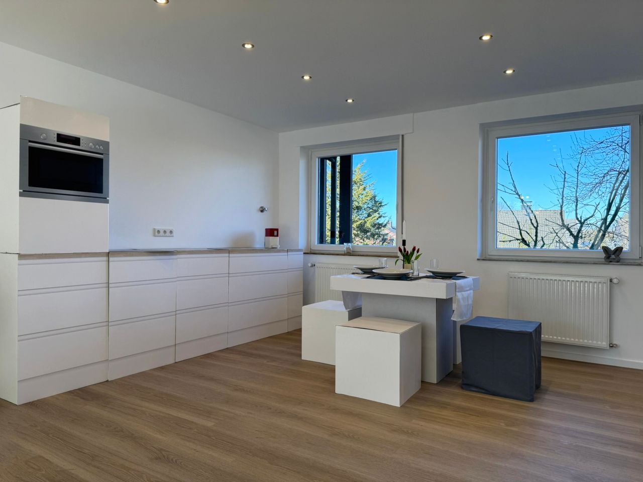 In den Wohnräumen ist ein hochwertiger Vinyl-Plankenboden verlegt, während Gäste-WC und Badezimmer mit großformatigen Fliesen gestaltet sind. Die glatt verputzten Wände runden das zeitgemäße Gesamtbild harmonisch ab.