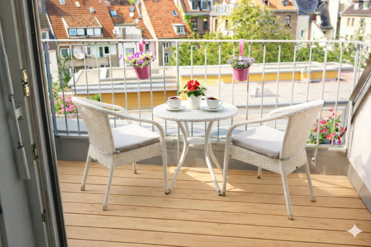 + Auf den Balkonen ist witterungsbeständiges Bangkirai-Holz verlegt