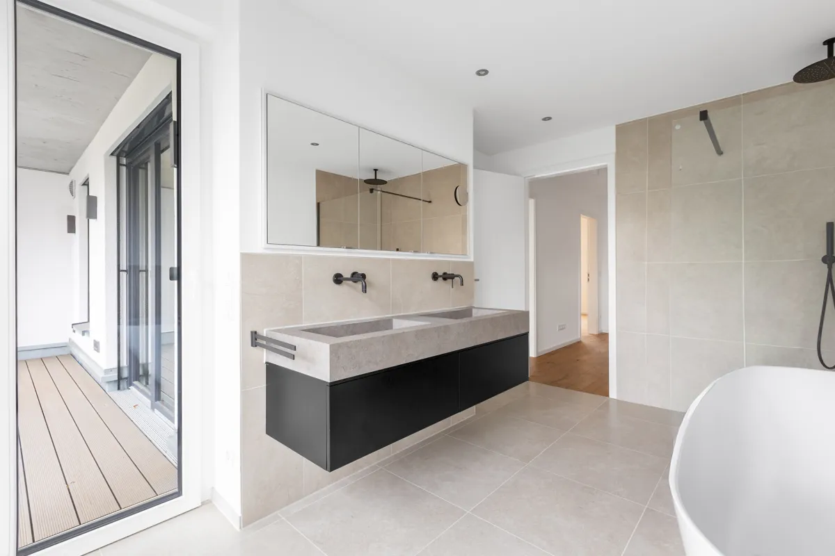 Im 1. Obergeschoss erwarten Sie zwei beeindruckend große Schlaf- bzw. Arbeitszimmer mit jeweils ca. 21 m². Das elegante Wellness-Bad bietet höchsten Komfort und schafft eine Wohlfühlatmosphäre für entspannte Auszeiten. Die angrenzende Loggia erweitert den Wohnraum und bietet einen geschützten Rückzugsort im Freien.