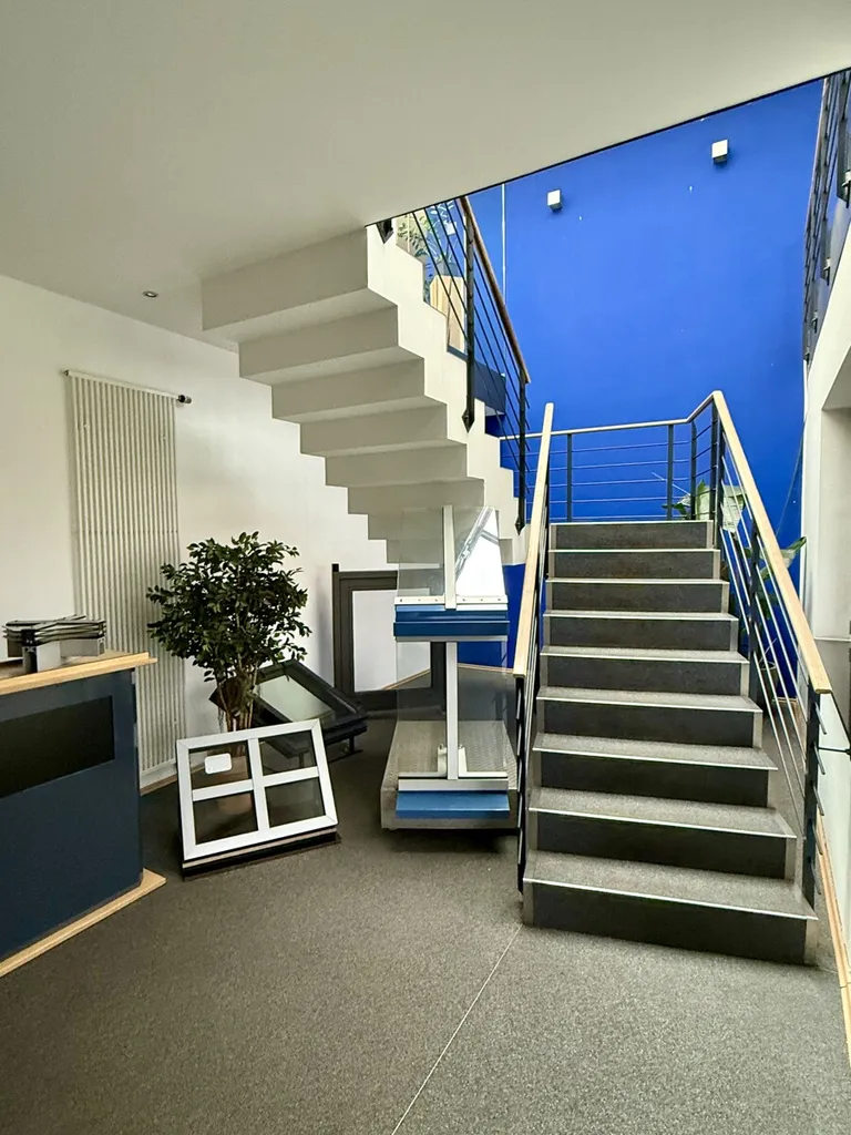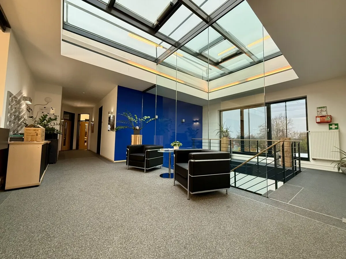 Ein besonderes Highlight ist der offene, lichtdurchflutete Treppen- und Loungebereich mit Glasdach und modernen Designelementen, der dem Objekt einen hochwertigen und einladenden Charakter verleiht – ideal für den Empfang von Kunden und Geschäftspartnern.
