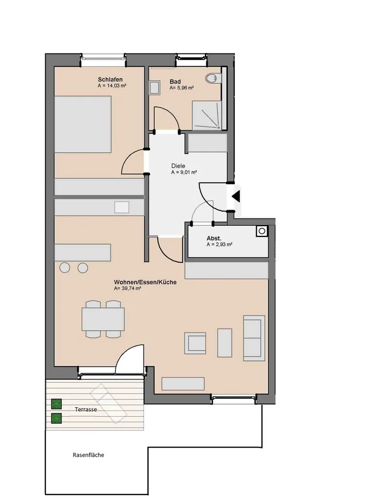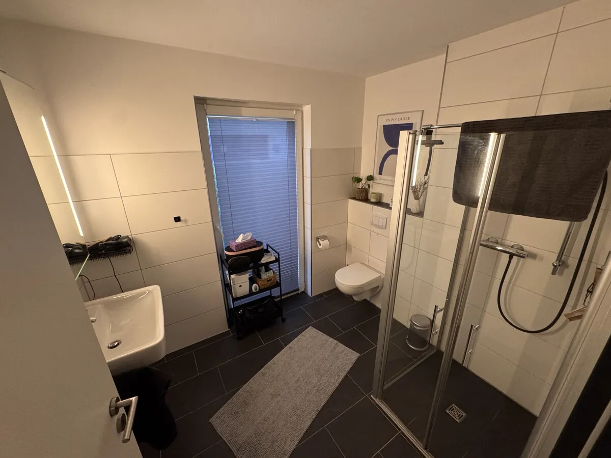 Die moderne 2-Zimmerwohnung mit Terrasse befindet sich in einem Mehrfamilienhaus mit insgesamt sechs Wohneinheiten. Aufgeteilt in Wohn/-Esszimmer mit offener Küche, Schlafzimmer, Abstellraum mit Waschmaschinenanschluss, Bad mit bodengleicher Dusche und WC. Zur Wohnung gehören ein Kellerraum und Kfz-Stellplatz.
