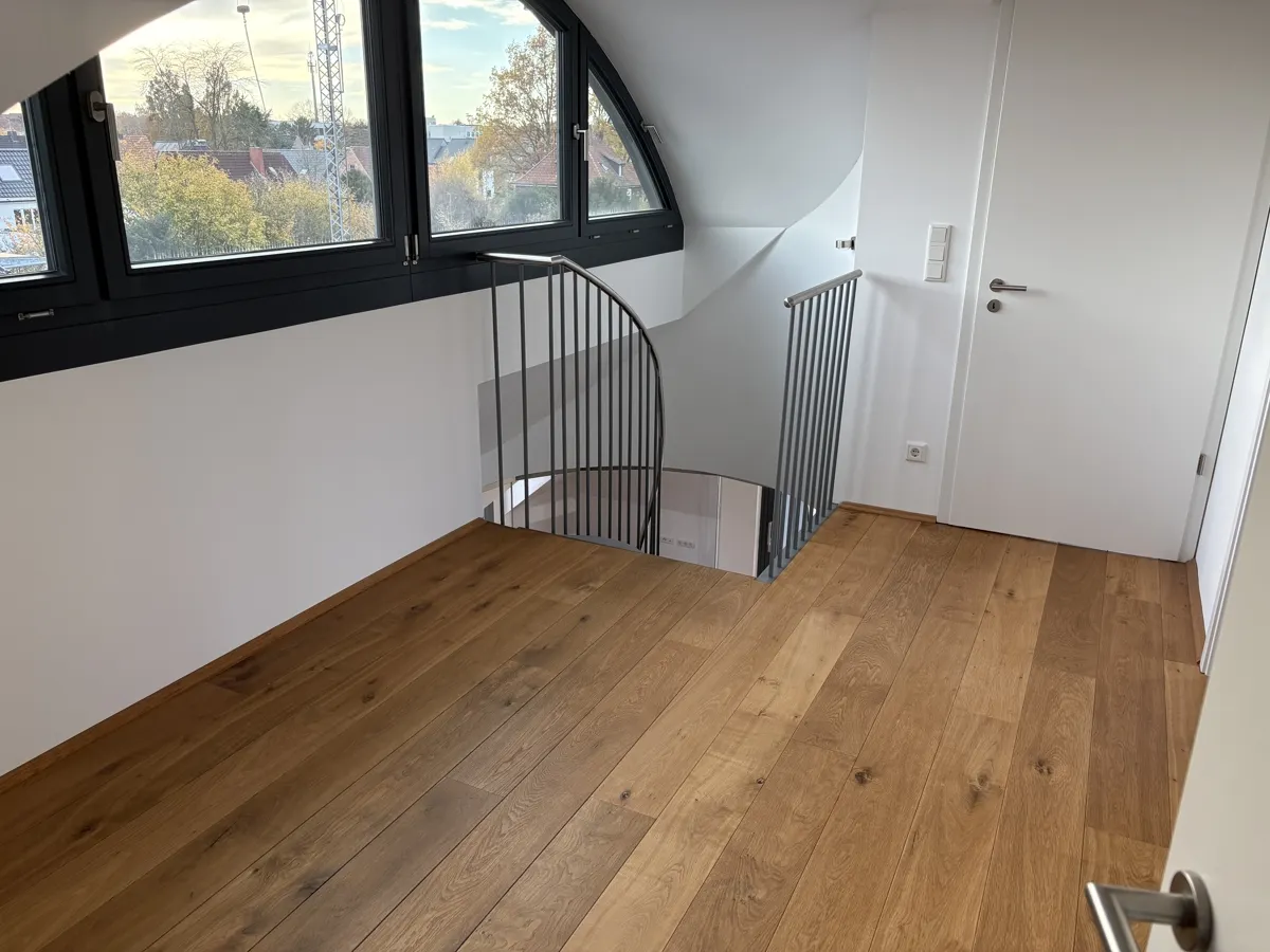 Die Wohnung besticht durch eine gehobene Ausstattung. Elegante Eichenparkettdielen in Wohn- und Schlafzimmern sowie anthrazitfarbene Fliesen im Küchen- und Badbereich unterstreichen das moderne Erscheinungsbild. Mittels elektrischen Raffstores lassen sich die Räume bequem verschatten. Die Fußbodenheizung schafft ein angenehmes Raumklima. Auf jeder Etage befindet sich ein modernes Tageslichtbad, das jeweils mit einer Dusche ausgestattet ist, oben auch mit einer Badewanne. Der sonnige Balkon mit Westausrichtung und Markise lädt zum Verweilen ein und gewährt einen herrlichen Ausblick in die geschmackvolle Gartenanlage.