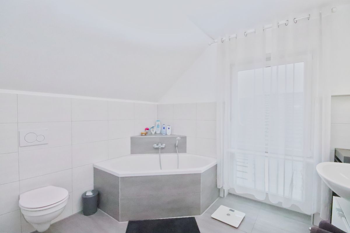 Das Tageslichtbad ist mit Dusche und Badewanne ausgestattet und erfüllt damit alle Anforderungen des Familienalltags. Ein separates Gäste-WC ergänzt den Wohnkomfort ideal.