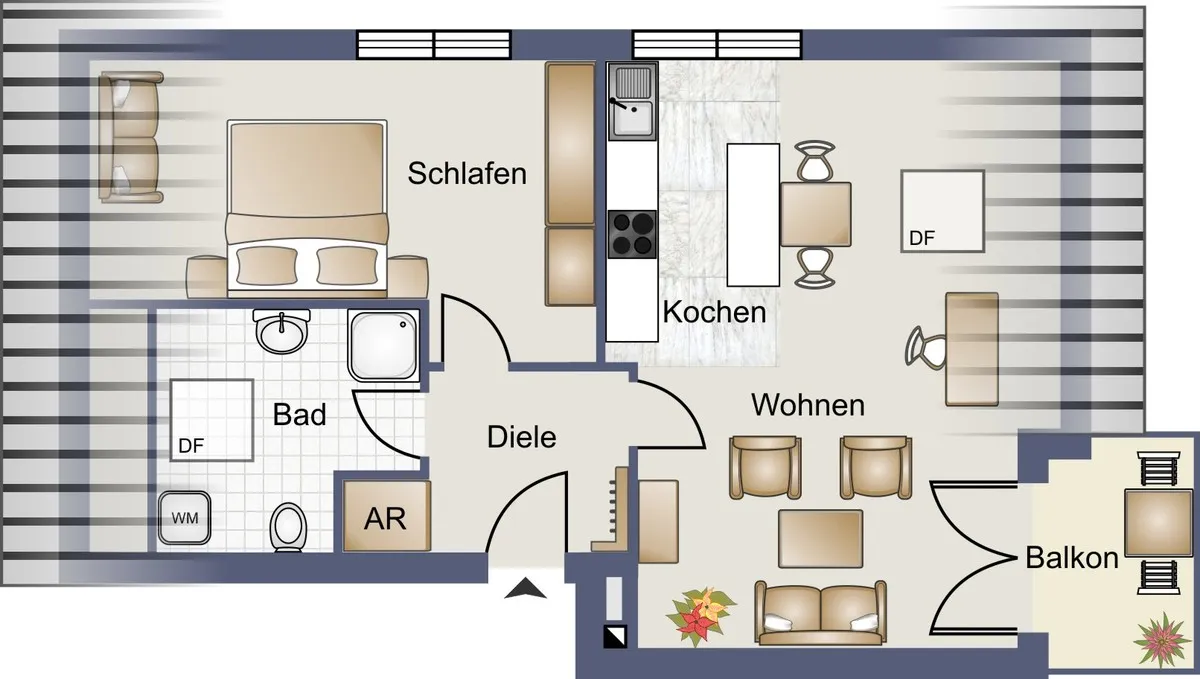 Im Dachgeschoss eines modernen 7-Familienhauses befindet sich diese großzügige 2-Zimmer-Dachgeschoss-Wohnung. Die Aufteilung ist gut für 1 bis 2 Personen geeignet und besteht aus Wohn-Esszimmer mit offener Küche, großer Balkon, Abstellraum, Diele, 1 Schlafzimmer, Bad mit Dusche und WC. Zur Wohnung gehört ein separater Keller sowie ein eigener Kfz-Stellplatz, der mit zusätzlich 20,00 € monatlich berechnet wird. Den Mietern des Hauses steht eine gemeinschaftliche Garage zur Unterbringung von Fahrrädern zur Verfügung.
