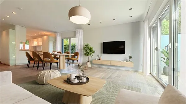 Über das Entree gelangen Sie in einen überdimensionalen Wohnbereich, der mit breiter Fensterfront und schönem Blick auf die sonnige Terrasse.