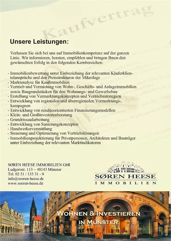 Münster-Nienberge, ein beliebter Stadtteil im Norden von Münster, der sich vor allem durch seinen attraktiven Ortskern mit umfangreicher Infrastruktur sowie seiner Naturnähe bei gleichzeitig bester Verkehrsanbindung ins Zentrum von Münster und zur Autobahn auszeichnet. Zahlreiche Dorfbau-ernschaften umgeben Nienberge und bieten reizvolle Rad- und Wanderwege in umliegende Grünanlagen und Waldgebiete. Freizeitwerte wie Sportplatz, Reithalle, Golfplatz und Freibad sind ebenso wie Schule und Kindergarten direkt vor Ort. - Und wer einmal in Nienberge gewohnt hat, wird sich seinen Vorzügen nur schwer wieder entziehen können ...