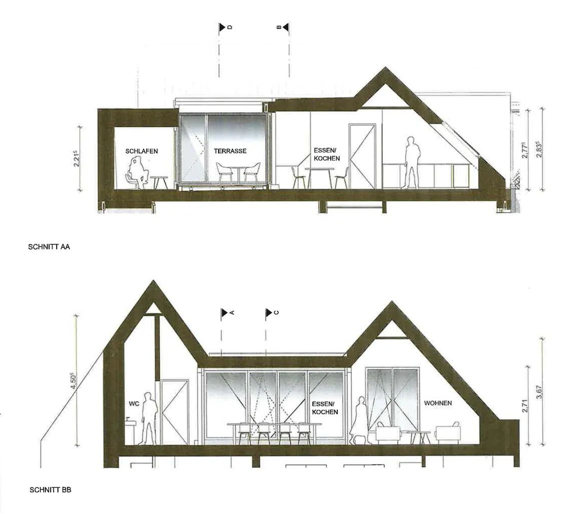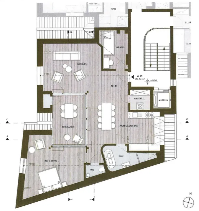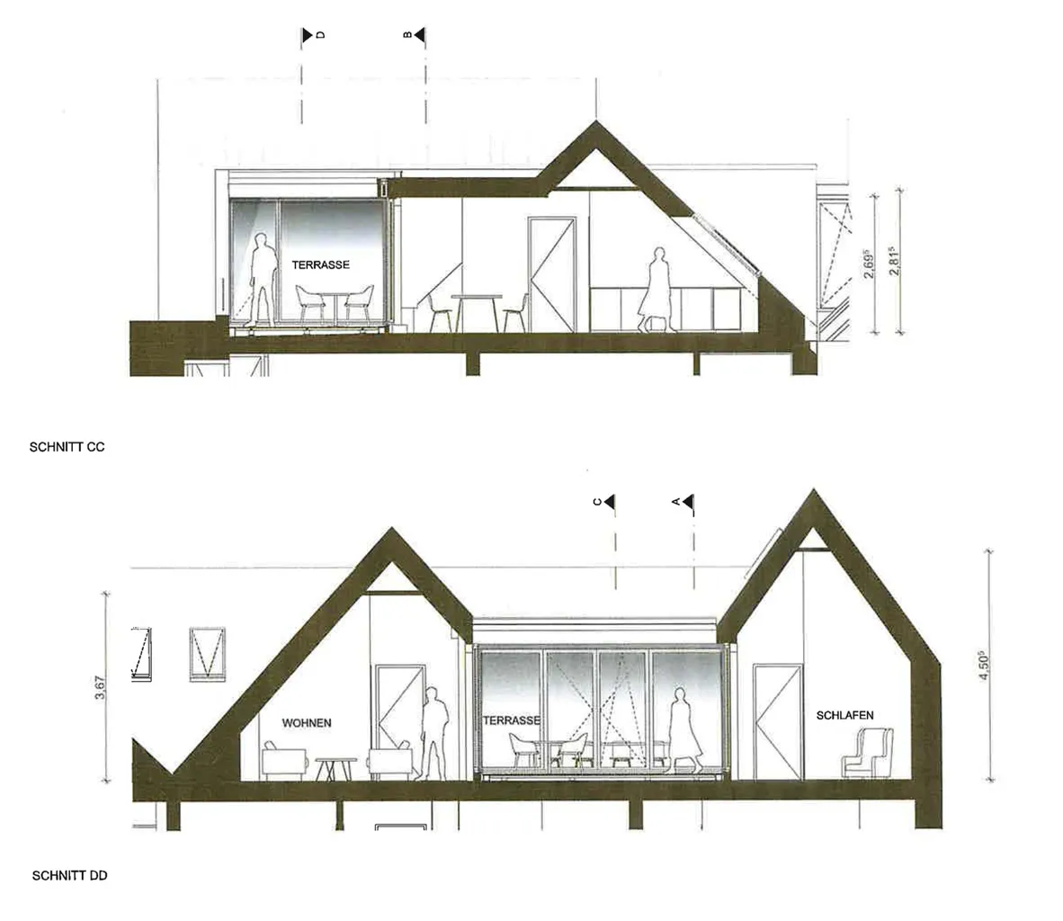 Die Wohnung umfasst eine Wohnfläche von rund 107 m² und überzeugt durch ihr offenes, lichtdurchflutetes Raumkonzept. Herzstück der Wohnung ist der großzügige Wohn- und Essbereich mit offener Küche, der durch bodentiefe Fenster und den Zugang zur zentral gelegenen Dachterrasse ein helles und freundliches Wohnambiente bietet. Die Terrasse ist harmonisch zwischen den beiden Giebeln integriert und lädt zu entspannten Stunden im Freien ein und ist zudem mit einer kompletten Horizontal-Verschattung ausgestattet.