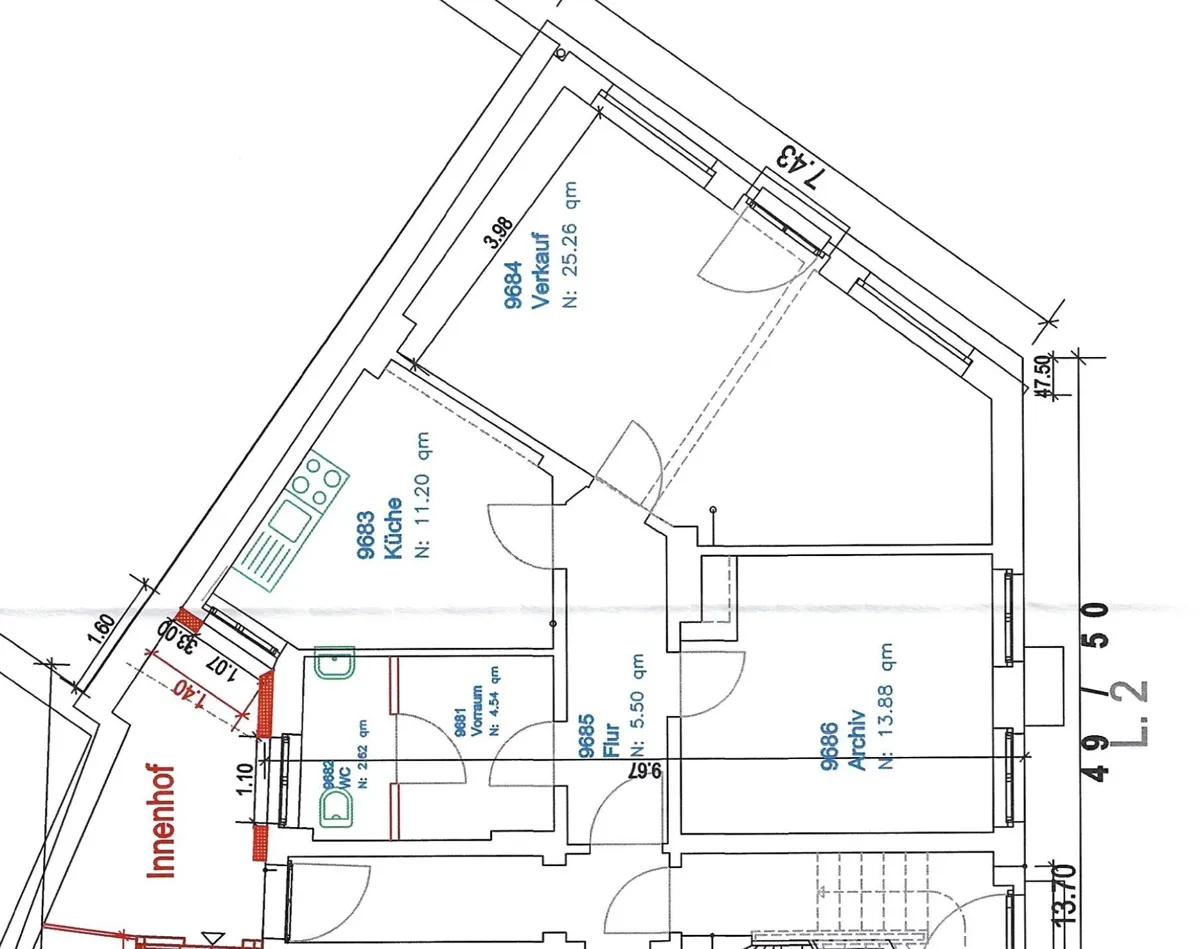 Das Ladenlokal mit einer Größe von ca. 63 m² Nutzfläche verteilt sich auf die attraktive Ladenfläche mit großen, attraktiven Fensterflächen, einen Archivraum, sanitäre Einrichtung sowie einen Aufenthaltsraum mit Zugang zum gemeinschaftlichen Innenhof!