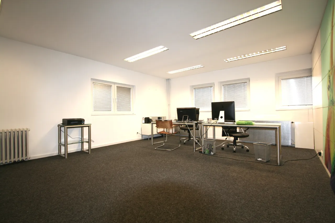 Die Halle verfügt über einen besonders rutschhemmenden, säure- und verschleißfesten Epoxidharzboden, teilweise ergänzt durch Fliesen. Durch die Beheizung der Halle ist eine ganzjährige Nutzung gewährleistet. Die Büroräume sind sowohl mit Fliesen als auch mit Teppichboden ausgestattet und bieten ein angenehmes sowie funktionales Arbeitsumfeld. Die Immobilie besitzt ein Flachdach und befindet sich in einem ruhigen Hofraum, wodurch eine flexible Nutzung und gute Anlieferungsmöglichkeiten gegeben sind. Die offene Hallenstruktur in Kombination mit zusätzlichen Büroflächen macht das Objekt besonders attraktiv für Unternehmen, die Lagerung, Produktion und Verwaltung an einem Standort vereinen möchten.
