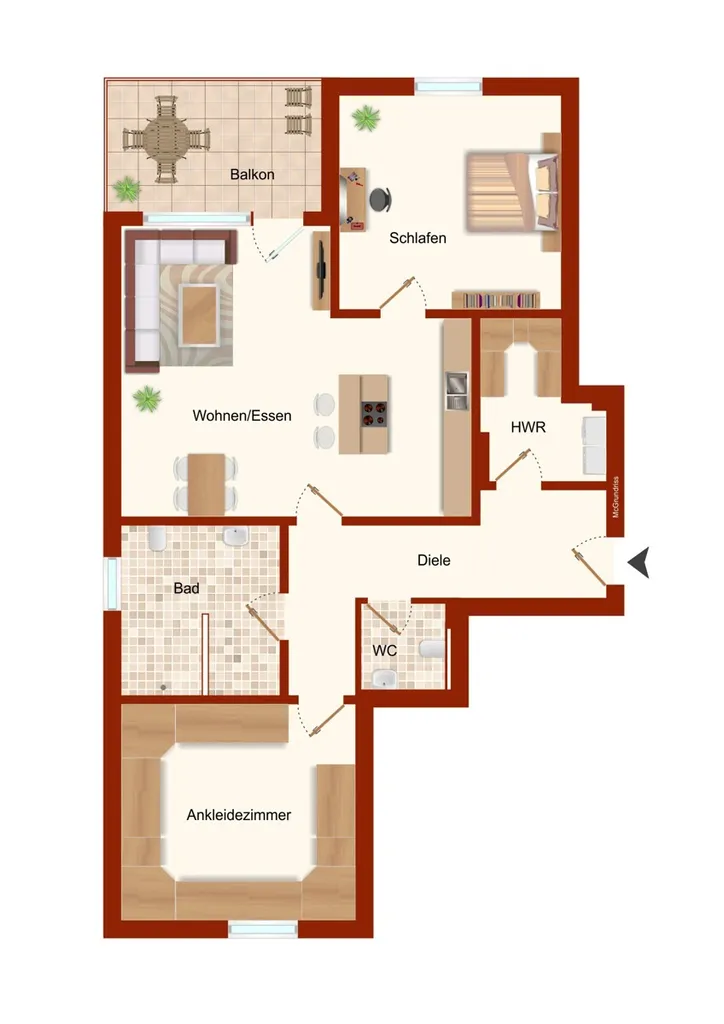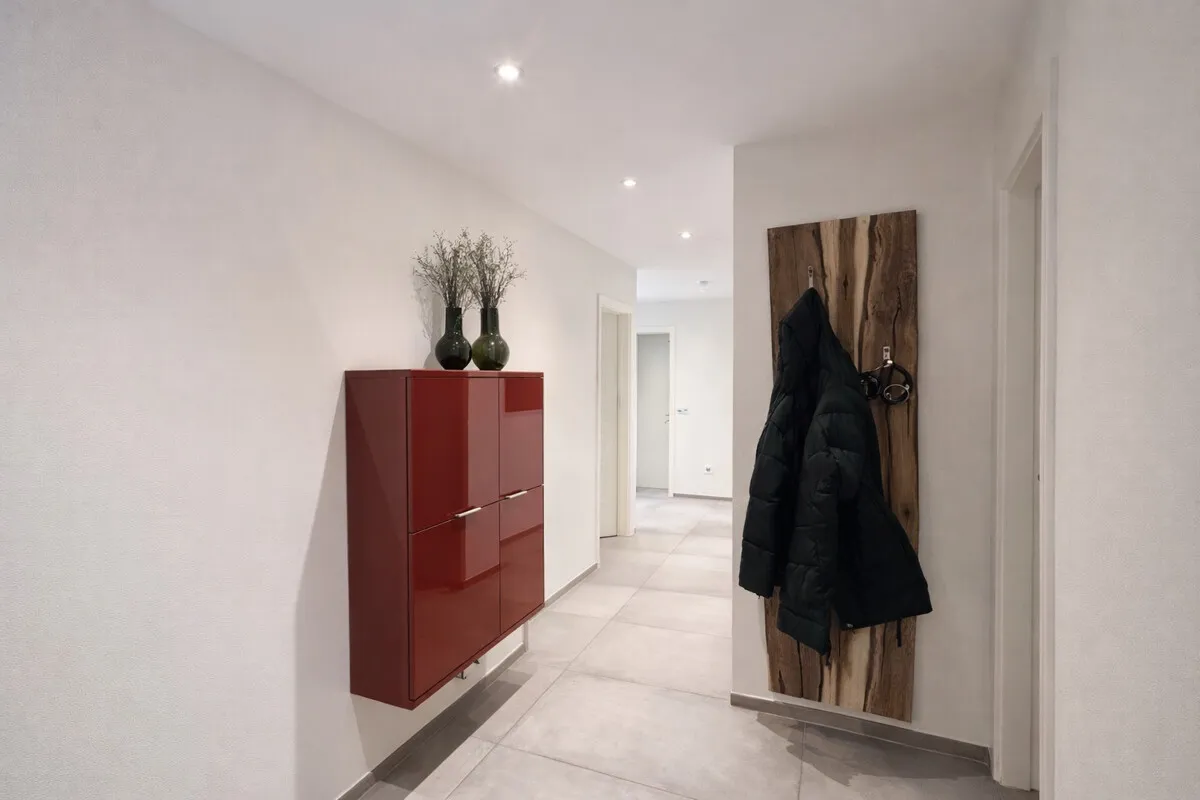 Bereits beim Betreten der Wohnung empfängt Sie eine großzügige Diele, die ausreichend Platz für Garderobe und Stauraum bietet und einen angenehmen ersten Eindruck vermittelt. Direkt angrenzend befindet sich der Hauswirtschaftsraum, der mit hochwertigen Einbauschränken sowie Anschlüssen für Waschmaschine und Trockner funktional und optisch überzeugt.