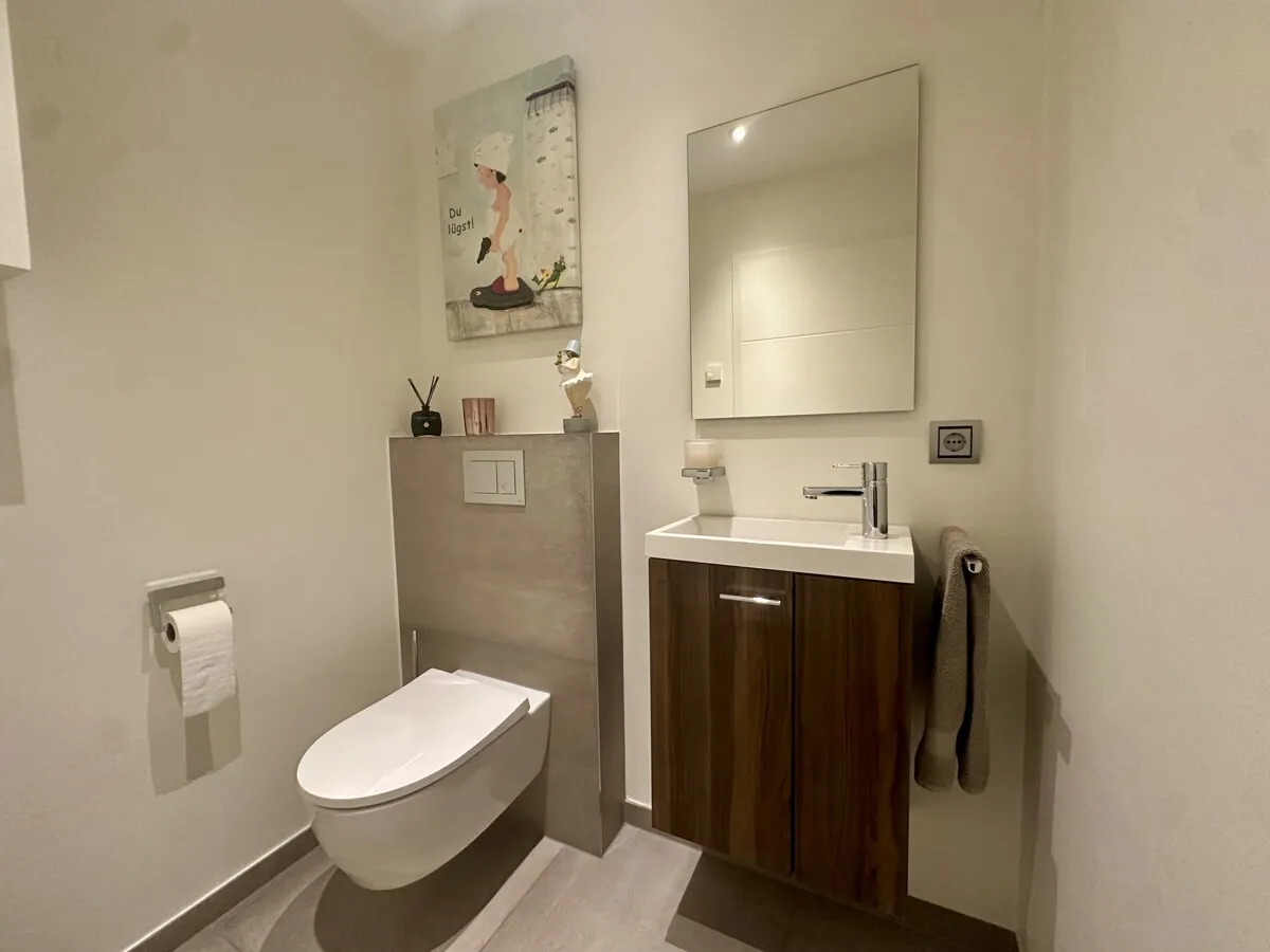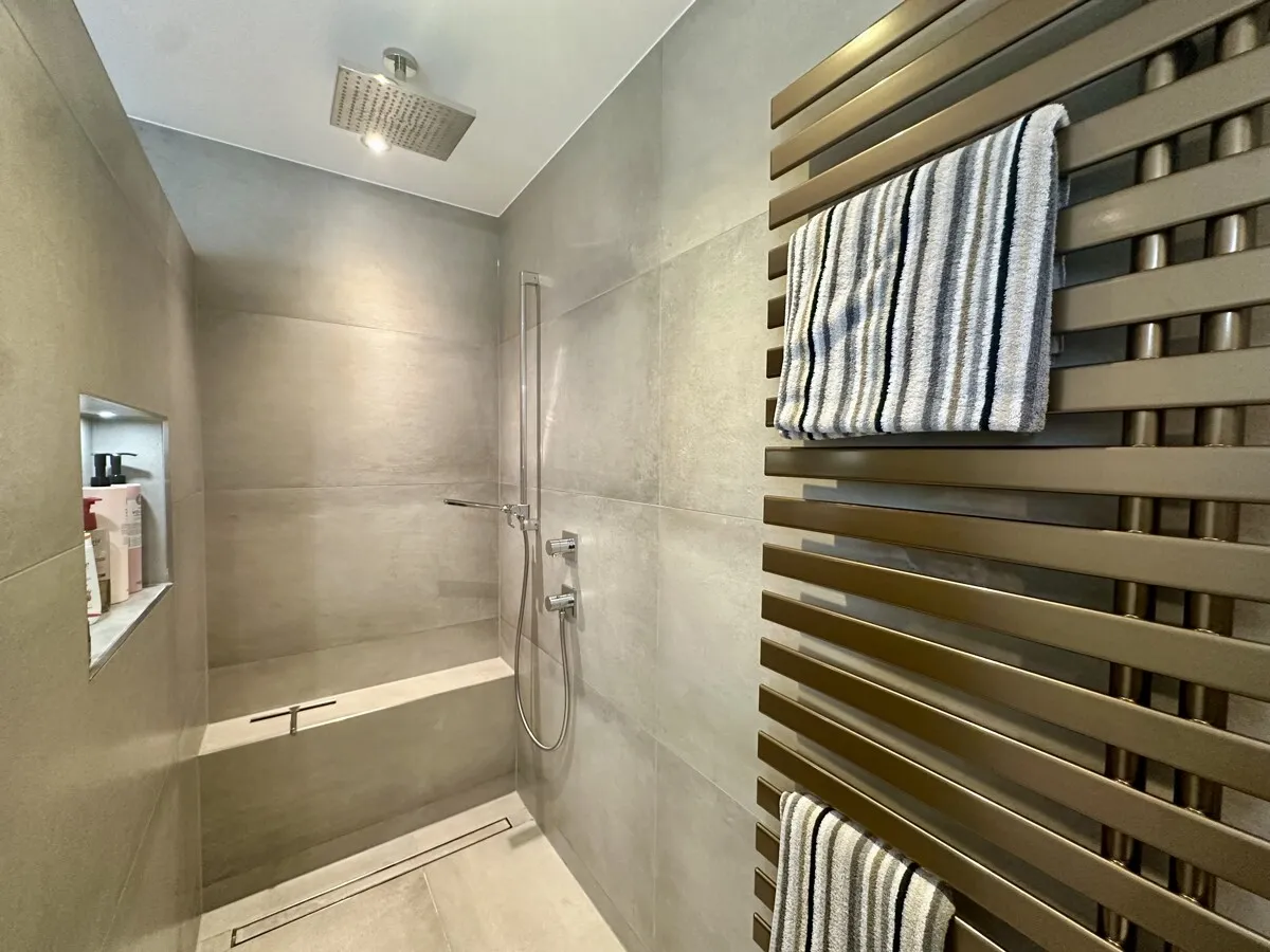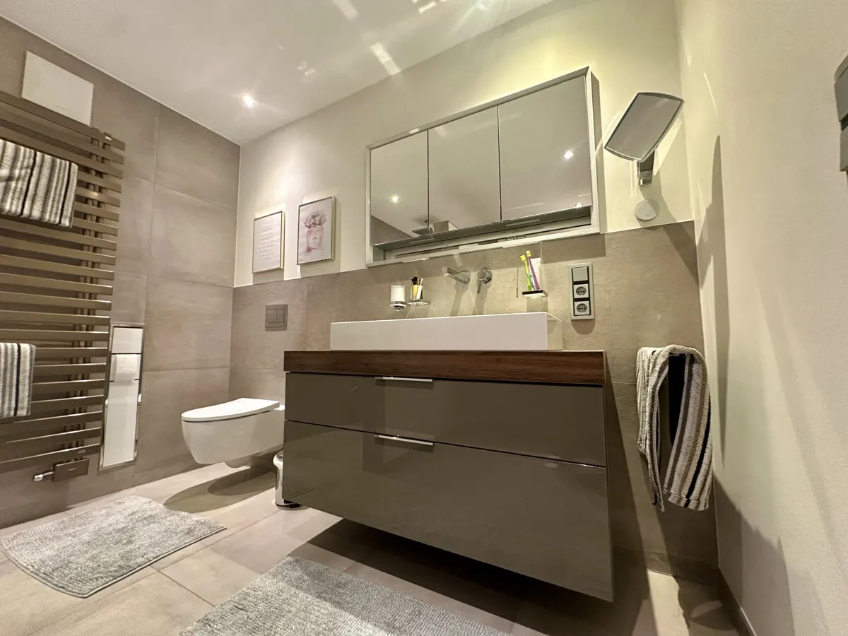 Das hochwertig ausgestattete Badezimmer überzeugt durch eine moderne Gestaltung mit bodengleicher Dusche, stilvollen Sanitärobjekten und zeitlosen Materialien. Ergänzt wird die Wohnung durch ein separates Gäste-WC, das zusätzlichen Komfort bietet.