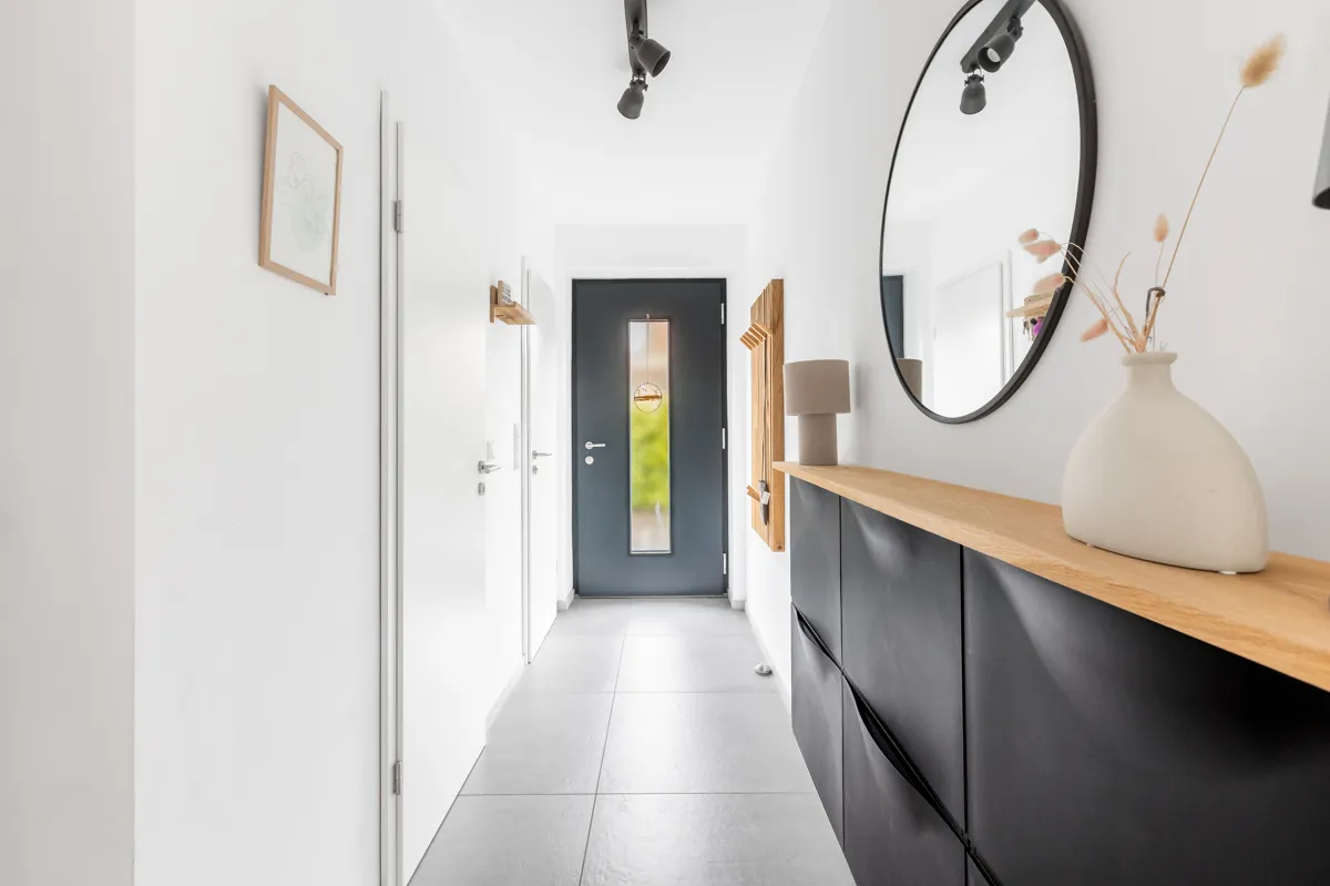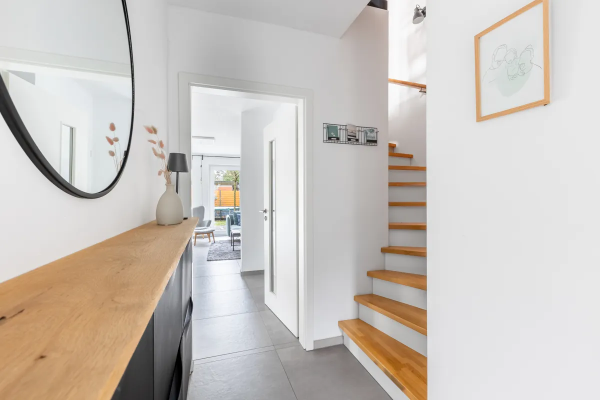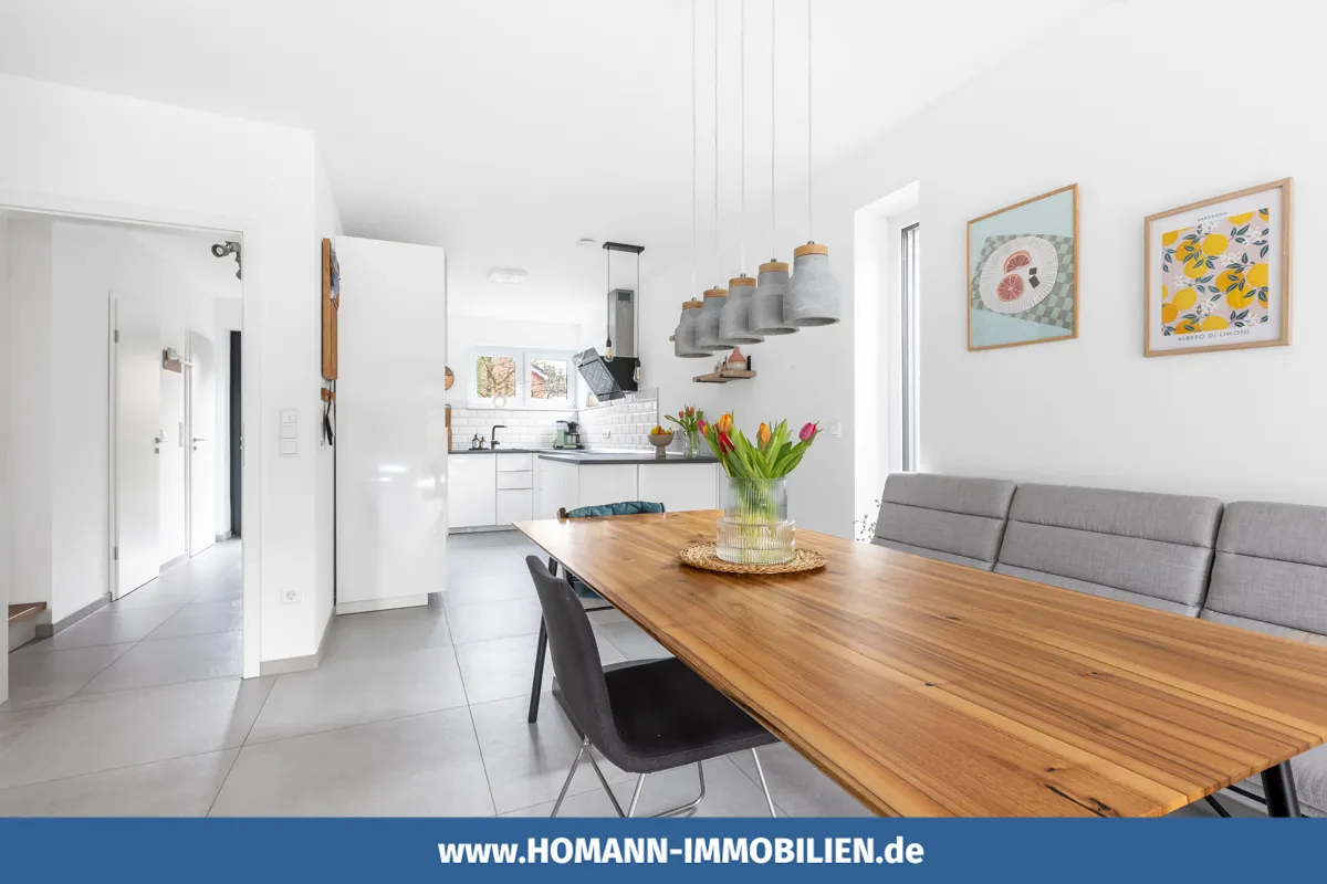 Hochwertige Materialien, dreifach verglaste Fenster, elektrische Rollläden, eine einbruchsichere Haustür sowie stilvolle Bodenbeläge unterstreichen den modernen Charakter des Hauses. Eine moderne Einbauküche und mehrere Bäder, darunter ein Gäste-WC sowie ein Bad auf jeder Wohnebene, bieten zusätzlichen Komfort im Alltag.