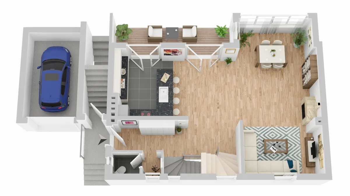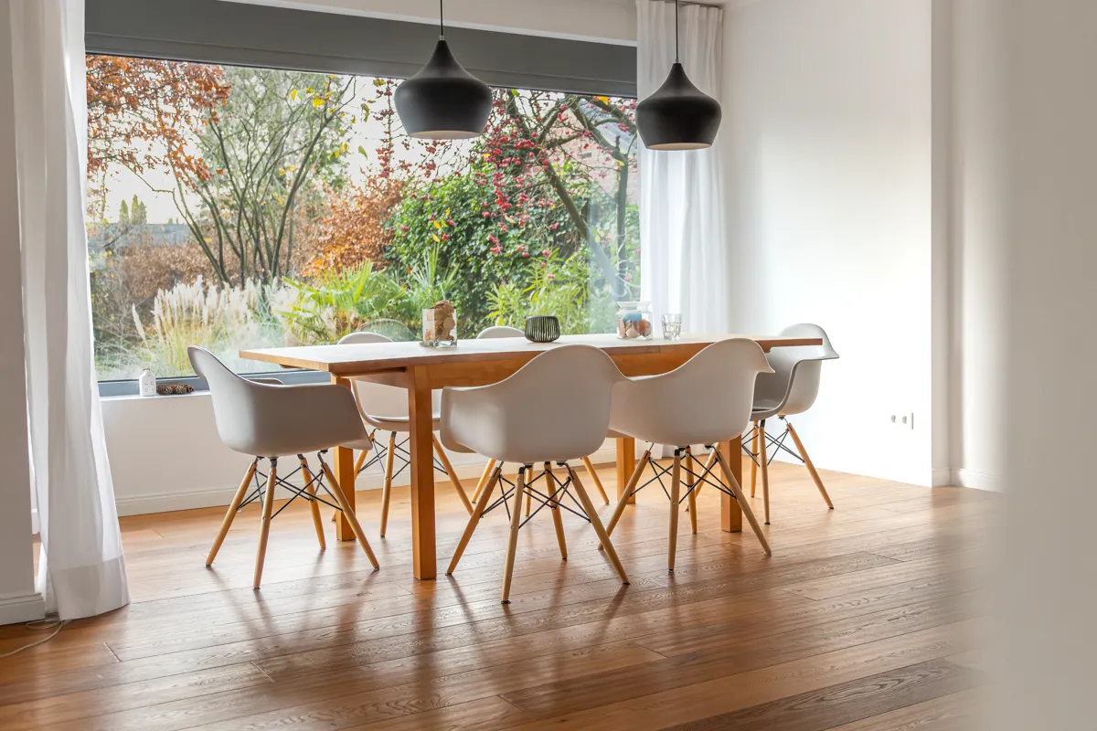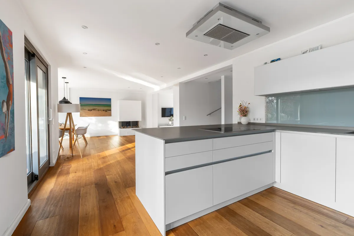 Im Erdgeschoss empfängt Sie ein großzügiger, offen gestalteter Wohn- und Essbereich mit großen Fensterfronten und schönem Blick in den nach Südwesten ausgerichteten Garten. Der Raum wurde umfassend modernisiert – inklusive Trockenbauarbeiten, neuer Decke, hochwertiger Bodenbeläge und einer Fußbodenheizung, die ein angenehmes Wohnklima erzeugt. Ein Gaskamin sorgt zusätzlich für eine warme, behagliche Atmosphäre.