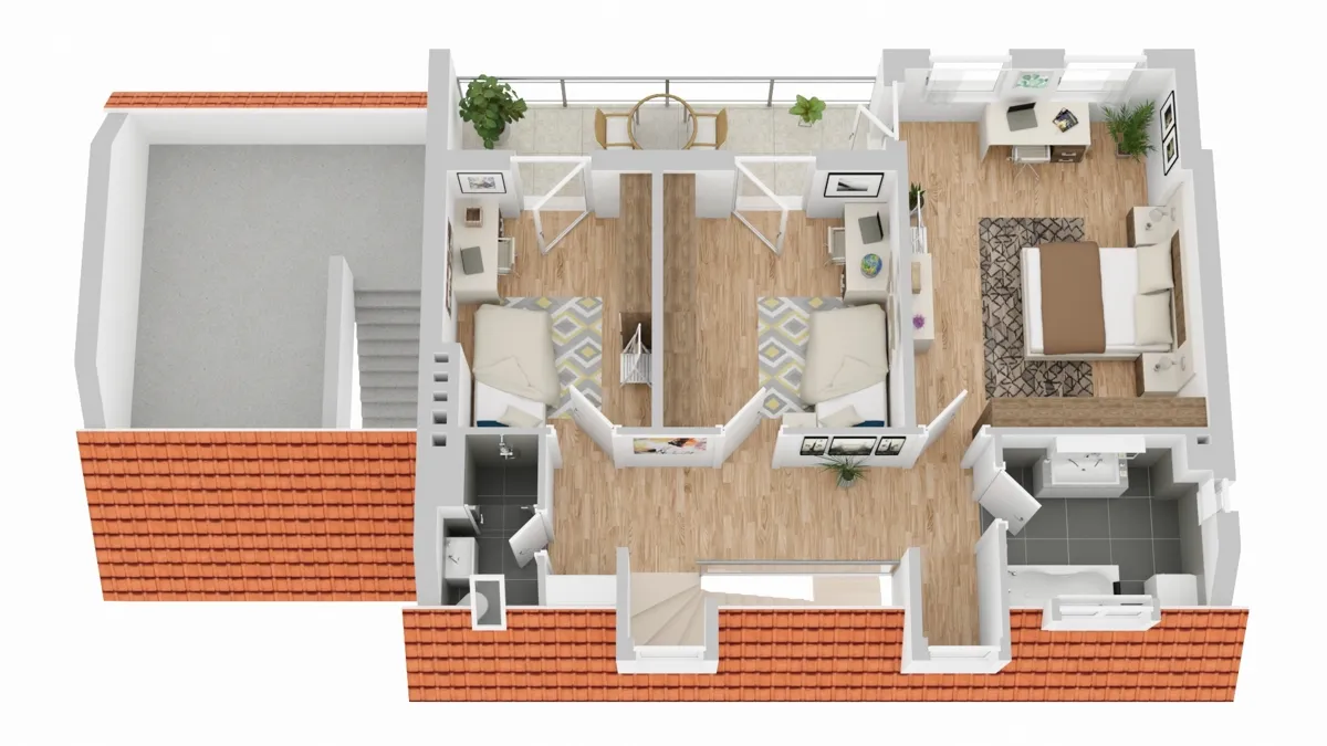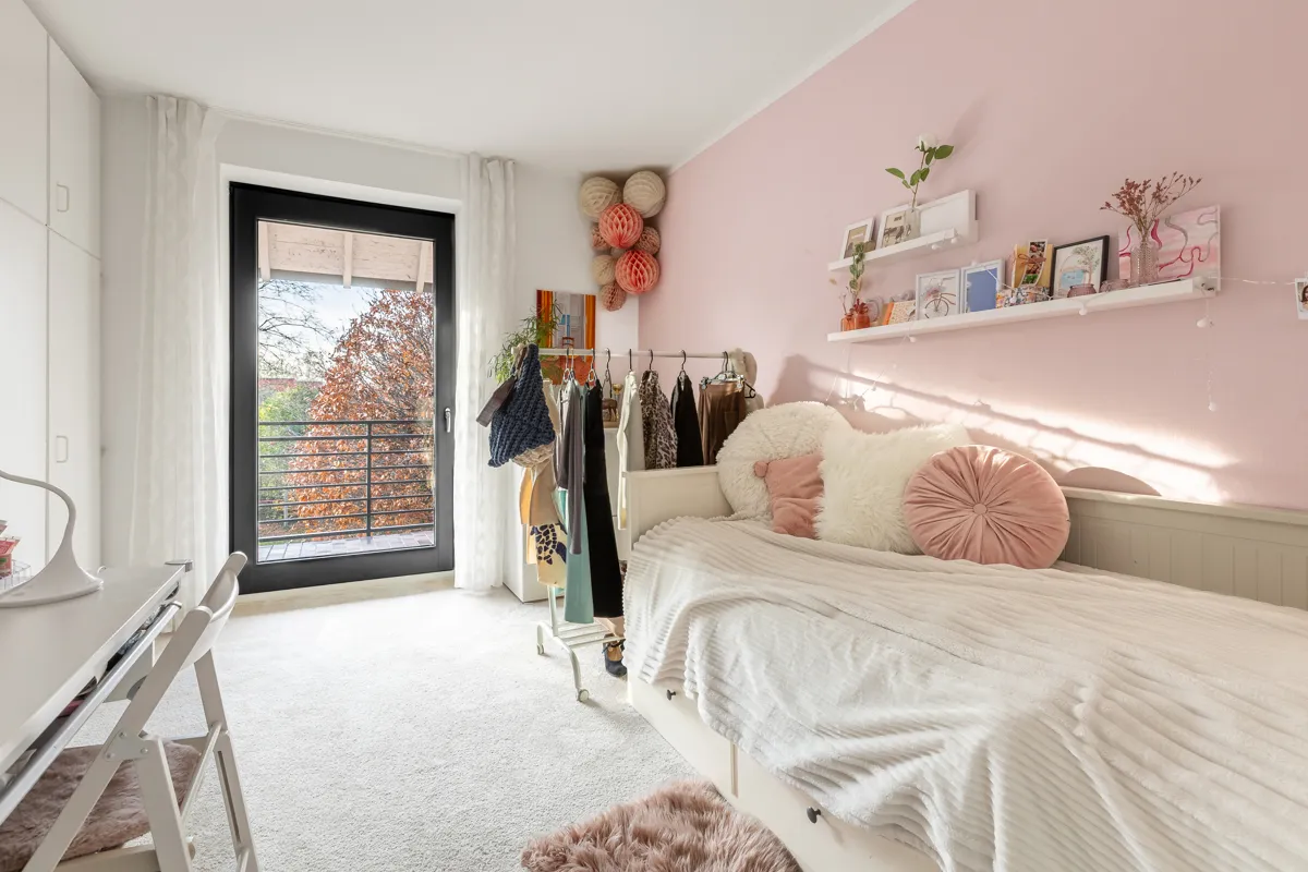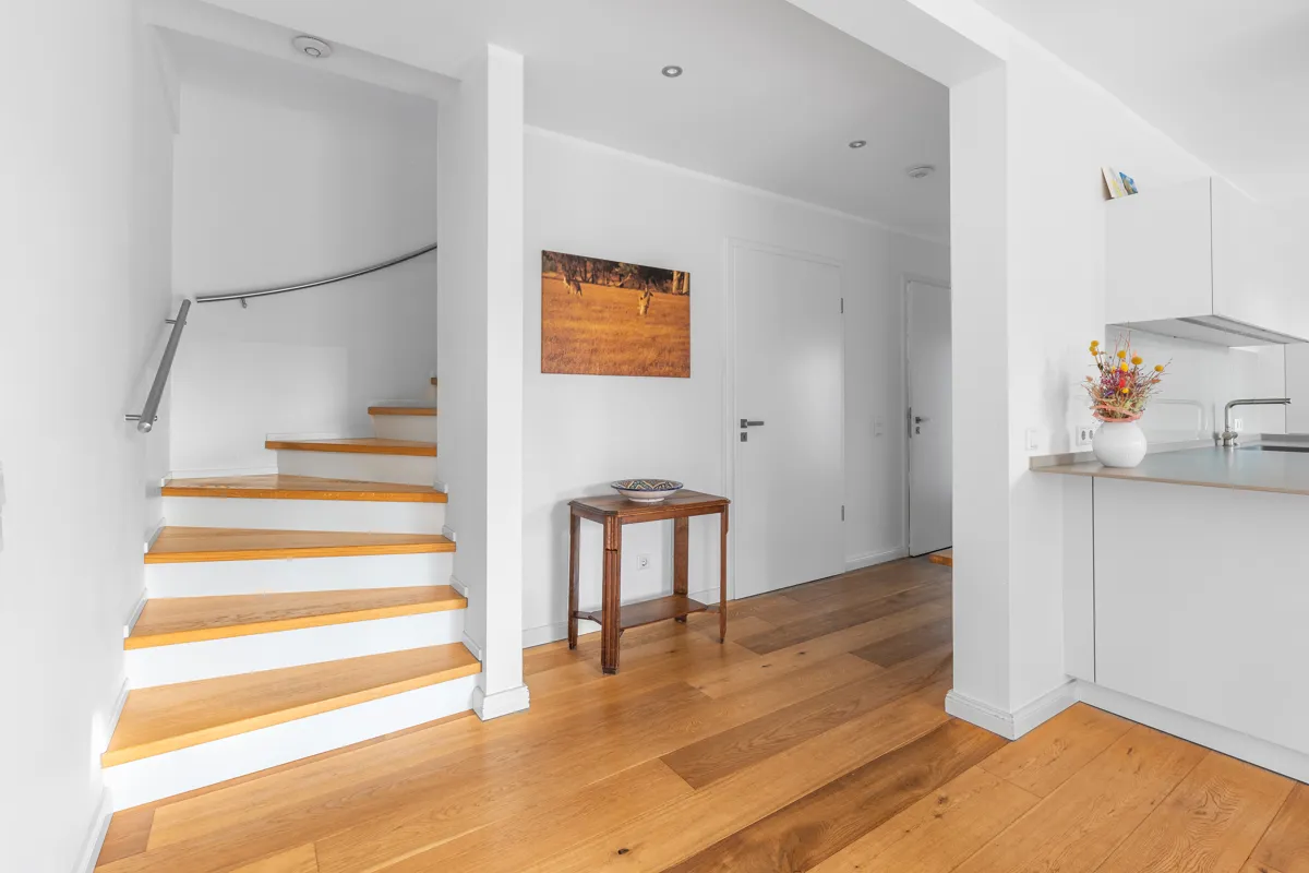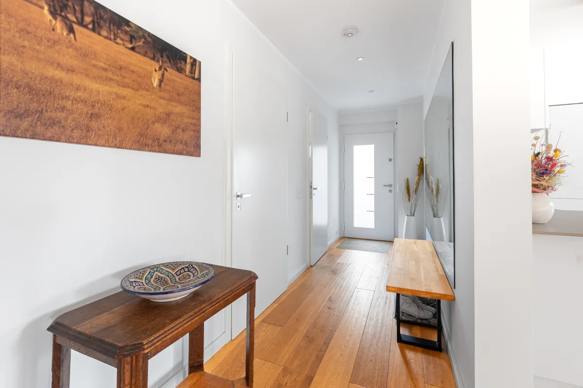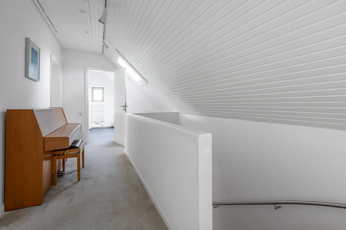 Im Obergeschoss befinden sich drei Schlafzimmer mit Balkonzugang sowie zwei modernisierte Bäder mit Fußbodenheizung. Auch hier wurden Elektrik, Sanitäranlagen und Bodenbeläge umfassend erneuert, ergänzt durch Rollläden für zusätzlichen Komfort.