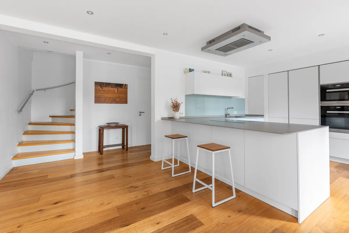 Die Küche wurde ebenfalls erneuert und mit einer hochwertigen Einbauküche der Firma Leicht ausgestattet. Ein modernes Gäste-WC, ebenfalls vollständig saniert, ergänzt das Raumangebot im Erdgeschoss.