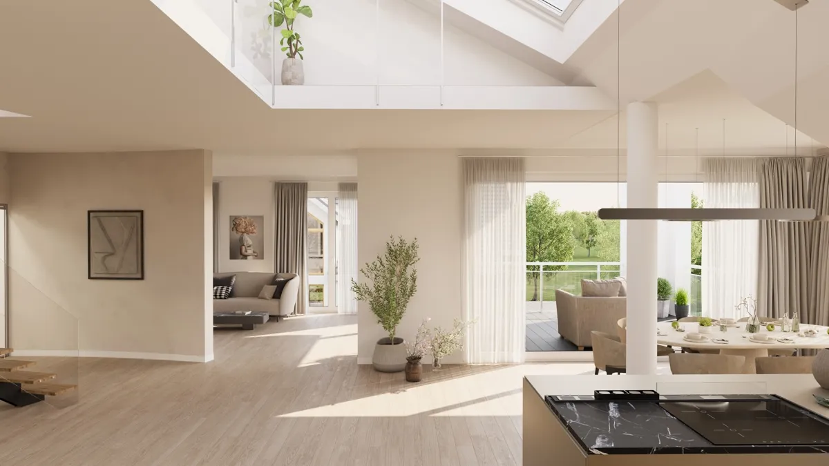 Im Obergeschoss erwartet Sie ein harmonisches Raumkonzept mit insgesamt fünf großzügigen Zimmern. Der lichtdurchflutete Wohn- und Essbereich, der sich über ca. 100 m² erstreckt, lädt mit angrenzendem Kaminzimmer zu geselligen Zusammenkünften und entspannten Abenden ein. Die bodentiefen Fenster sorgen für ein unverwechselbares Wohngefühl und bieten einen atemberaubenden Blick auf den Aasee.