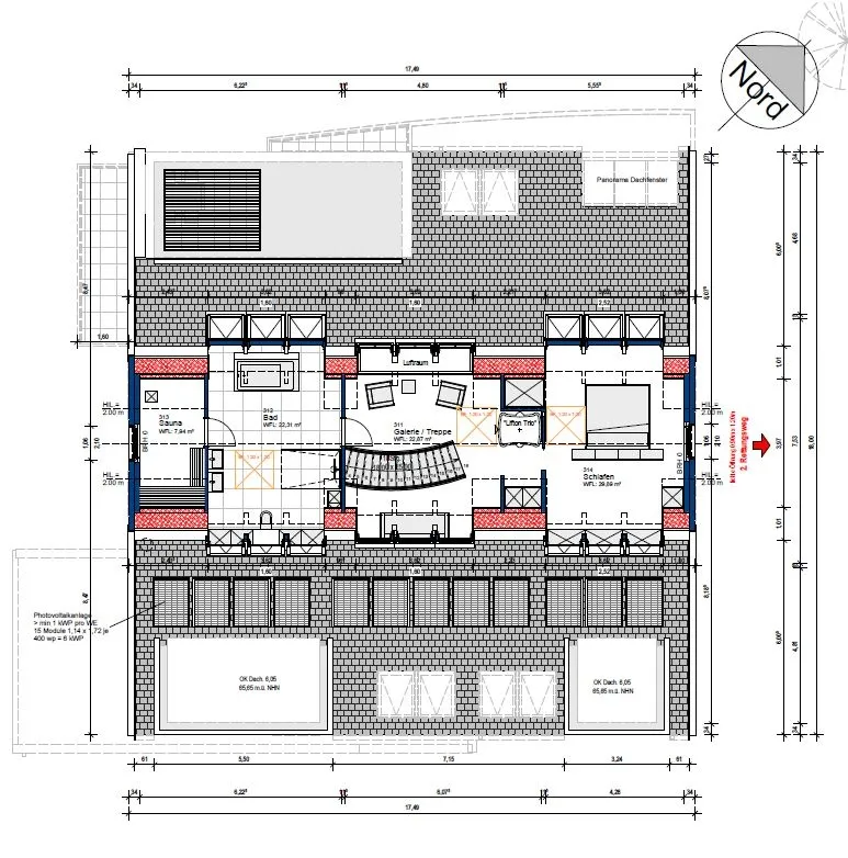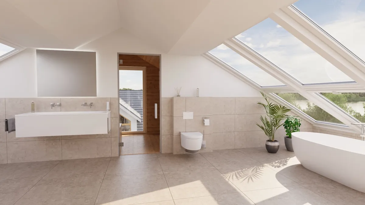 In das Dachgeschoss gelangen Sie sowohl über eine offen gestaltete, architektonische Treppe als auch über einen internen Lift in die Empore, die mit einem eleganten Sitzbereich und herrlichem Blick auf den Aasee ausgestattet ist. Das ca. 30 m² große Schlafzimmer bietet eine ruhige Rückzugsmöglichkeit und viel Platz für individuelle Gestaltung, einschließlich eines Ankleidebereichs. Auf der gegenüberliegenden Seite der Empore erwartet Sie ein luxuriöses Wellnessbad mit Sauna, das Entspannung auf höchstem Niveau bietet.